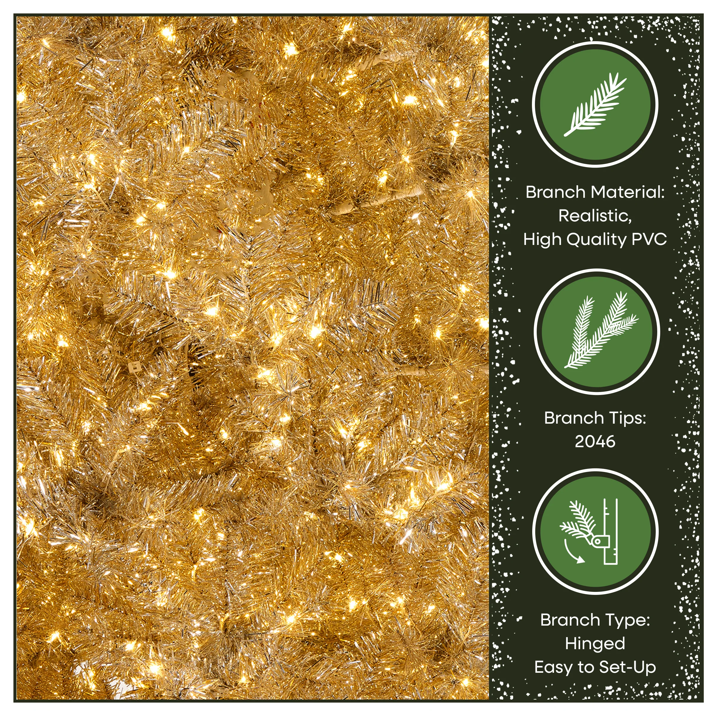 - PRE-LIT CHRISTMAS TREE: 9 foot artificial tree featuring 2,046 sparkling platinum metallic PVC branch tips that deliver a lush, full, 56” diameter with radiant winter flair