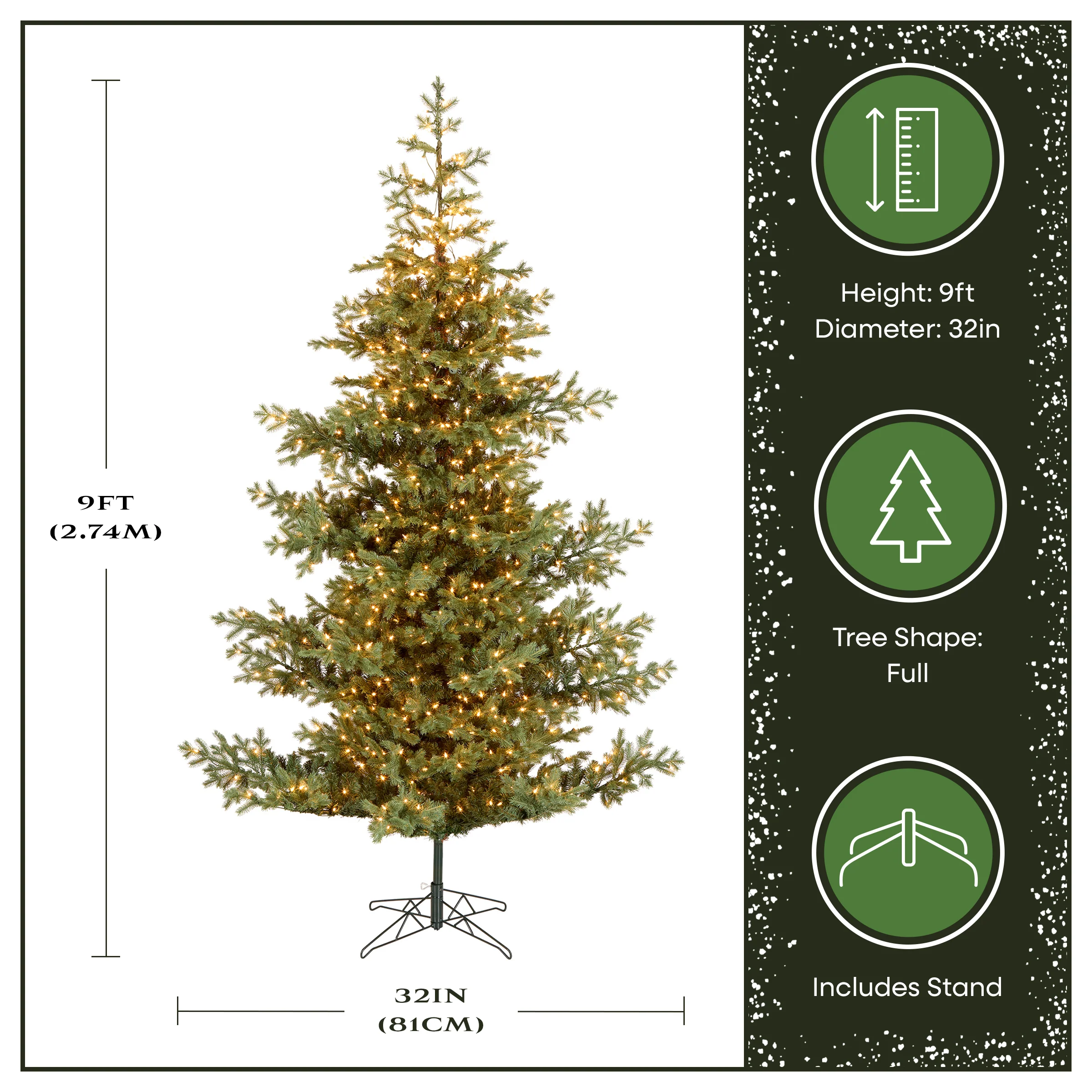 - LIFELIKE PRELIT CHRISTMAS TREE: 9 foot artificial tree with 32” base features 1,119 realistic PE Feel Real® and PVC branch tips for a lush, full appearance that elevates holiday décor