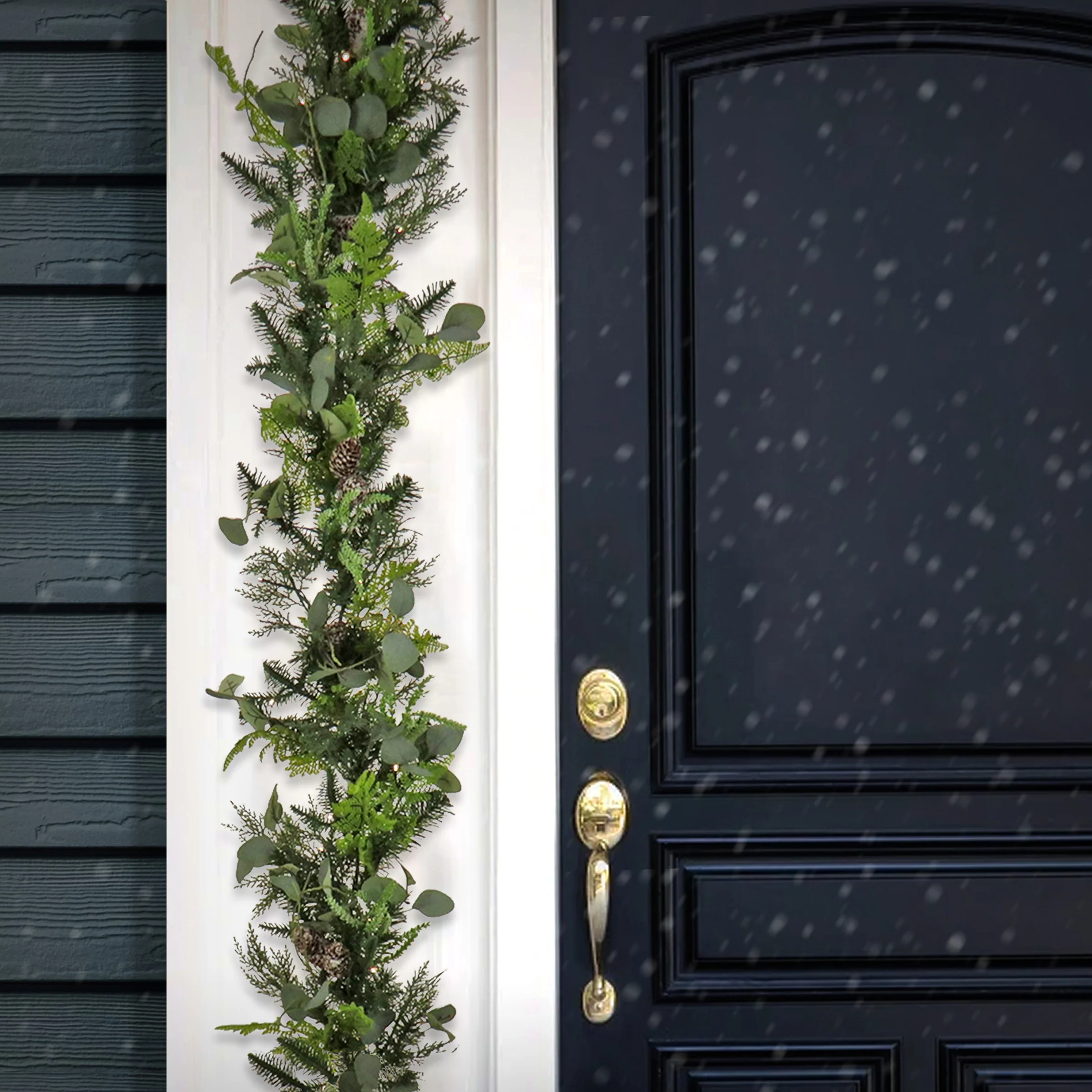 The HGTV Home Collection by National Tree Company Winter Garden garland features a mixture of evergreen tips, cedar tips and eucalyptus leaves flowing from a flexible vine base. A trimming of delicate fern fronds and frosted pinecones add natural appeal. It is pre-lit with 70 warm white battery-operated LED lights that are energy-efficient and long lasting. Included is an option for 6 hours ON/18 hours OFF timed operation. This garland can be displayed over doors, windows, fireplace mantels, fence, or stairway railings in indoor or outdoor locations.