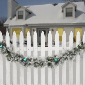 This Snowy Tinkham garland features snow-dusted evergreen and bristle branches decorated with assorted blue ball ornaments and snowy cedar tips. It is pre-lit with 50 battery operated warm white LED lights that are energy efficient and long lasting. Included is an option for 6 hours ON/18 hours OFF timed operation. This garland can be displayed over doors, windows, fireplace mantels, fence, or stairway railings. For indoor or covered outdoor display.