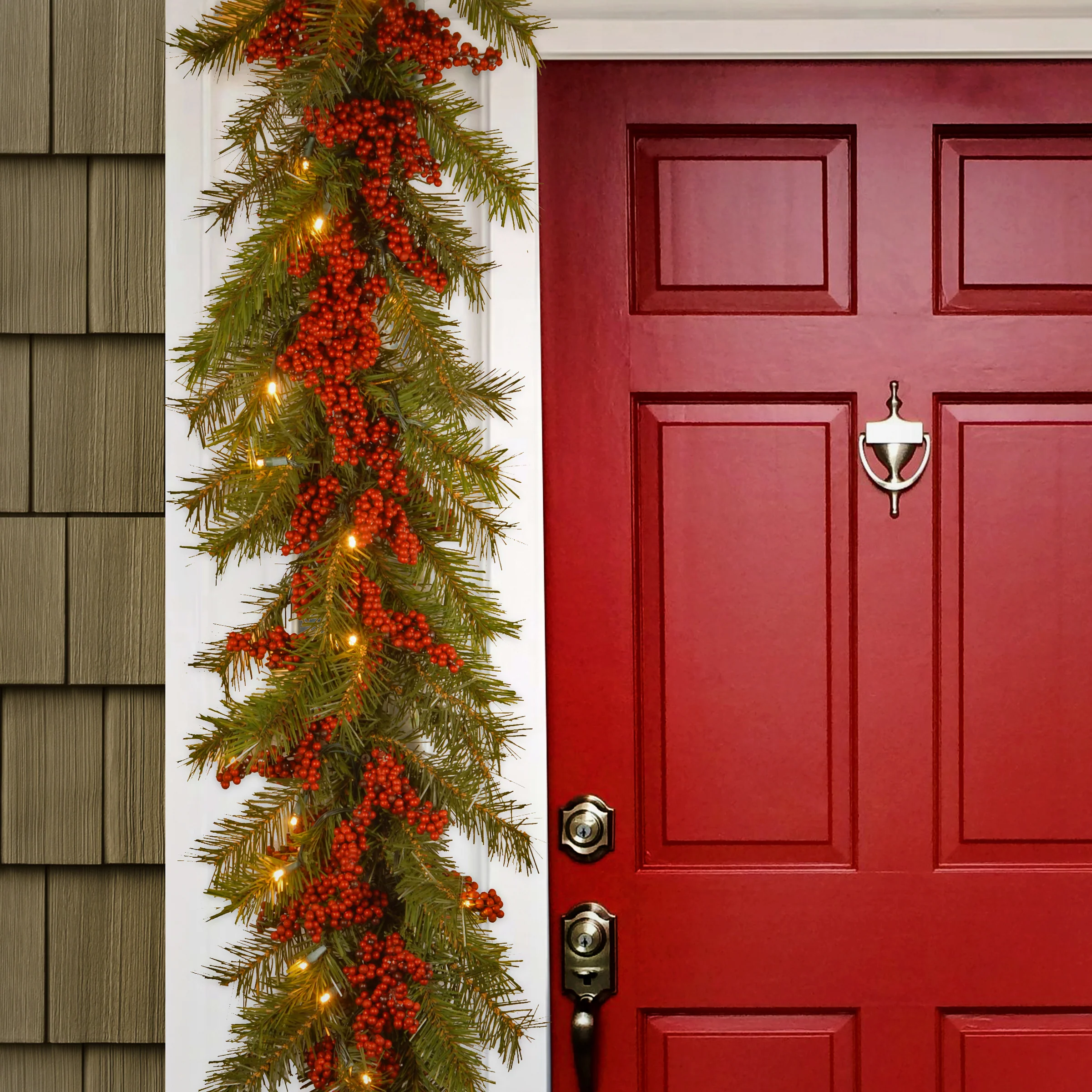 This Valley Pine garland is part of the Decorative Collection line of holiday decorating ideas. This thick green garland is trimmed with clusters of bright red berries. It is pre-lit with 50 battery operated warm white LED lights that are energy efficient and long lasting. Includes a 6 hours ON/18 hours OFF timed operation. This garland can be displayed over doors, windows, fireplace mantels, fence, or stairway railings in indoor or covered outdoor locations.