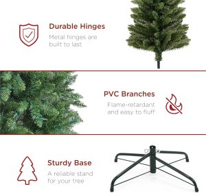 - HIGH-QUALITY MATERIALS: Crafted with durable metal hinges and flame-retardant PVC branches that stand tall with the help of a sturdy metal base, so your tree is ready to look its best for the season ahead!; OVERALL DIMENSIONS: 32.5″(Dia) x 90″(H)