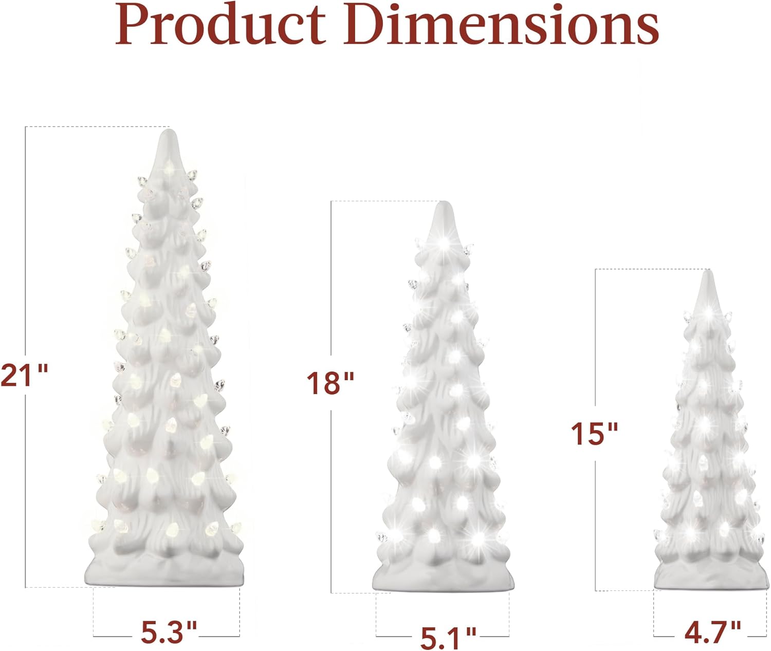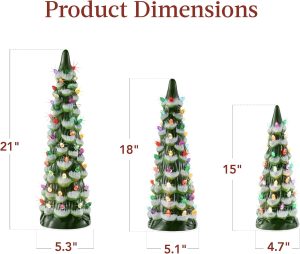 - EXPAND YOUR COLLECTION: Build your own holiday forest as you collect our festive and highly giftable ceramic trees to fill your home or office with seasonal cheer; 21IN TREE DIMENSIONS: 5.3″(Dia) x 21″(H); 18IN TREE DIMENSIONS: 5.1″(Dia) x 18″(H); 15IN TREE DIMENSIONS: 4.7″(Dia) x 15″(H)