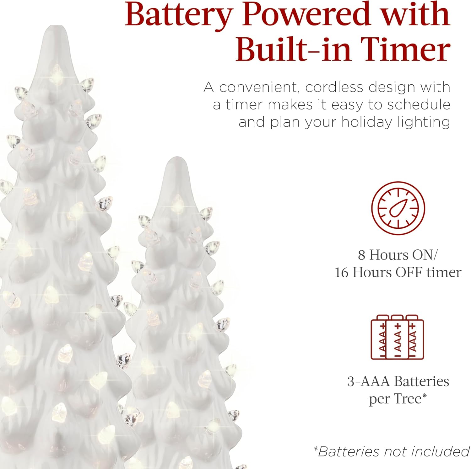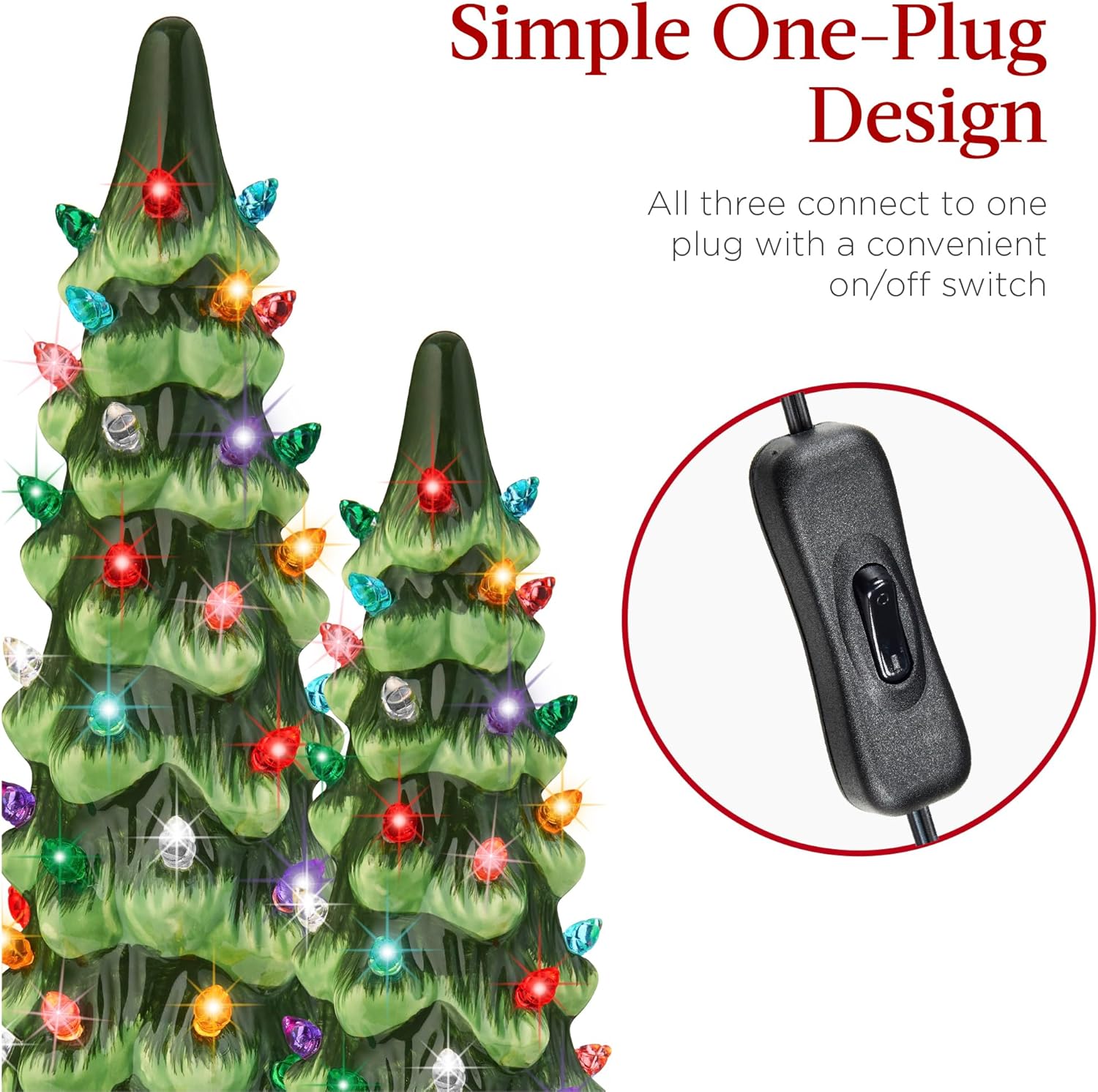 - SIMPLE ONE-PLUG DESIGN: All three trees connect to one plug with a convenient on/off switch, making setup quick and effortless