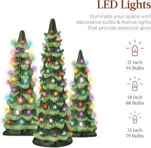 - LED LIGHTS: Features LED lights, and comes arrayed with a collection of decorative bulbs to brighten your holidays; decorative bulb counts (15in/18in/21in): 79/88/94