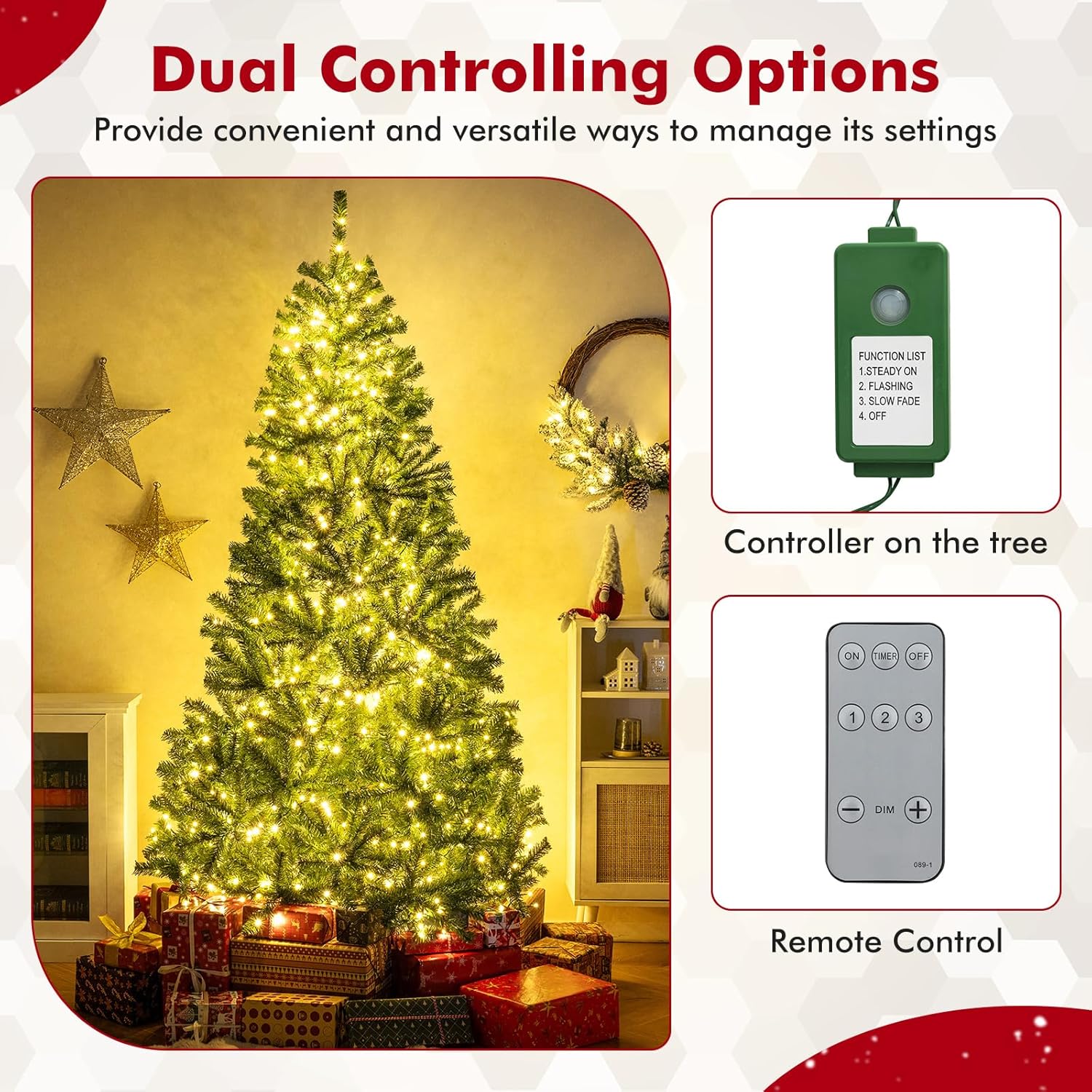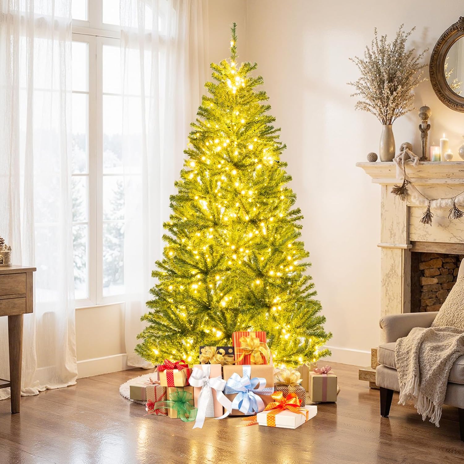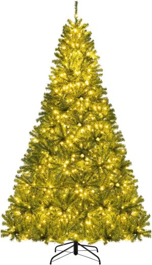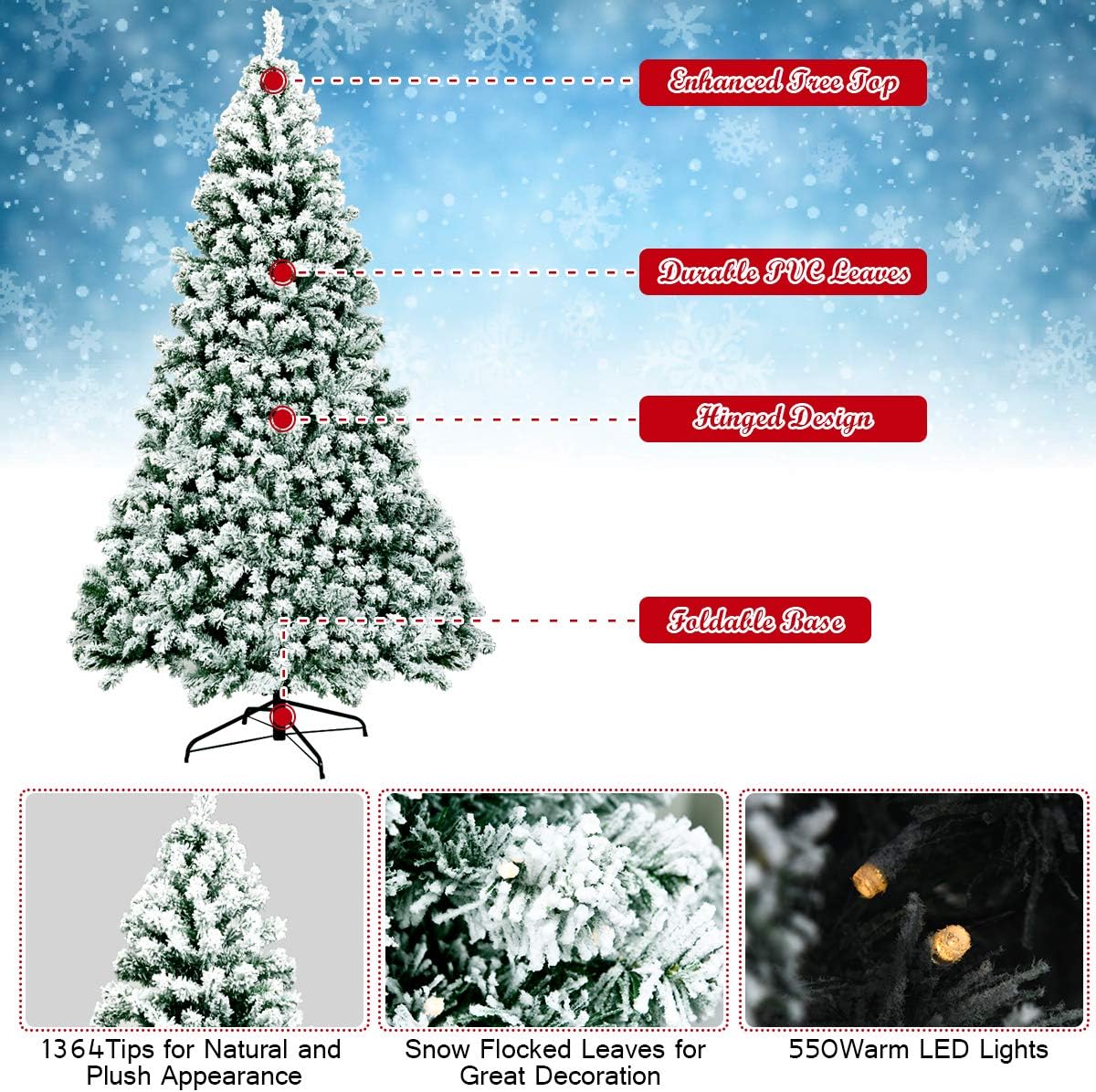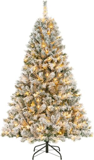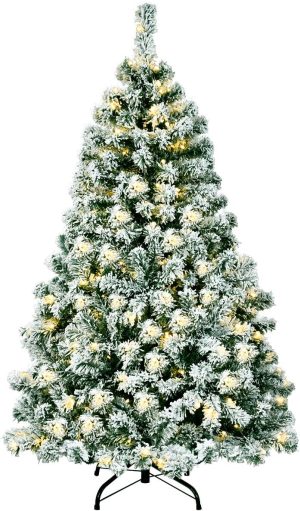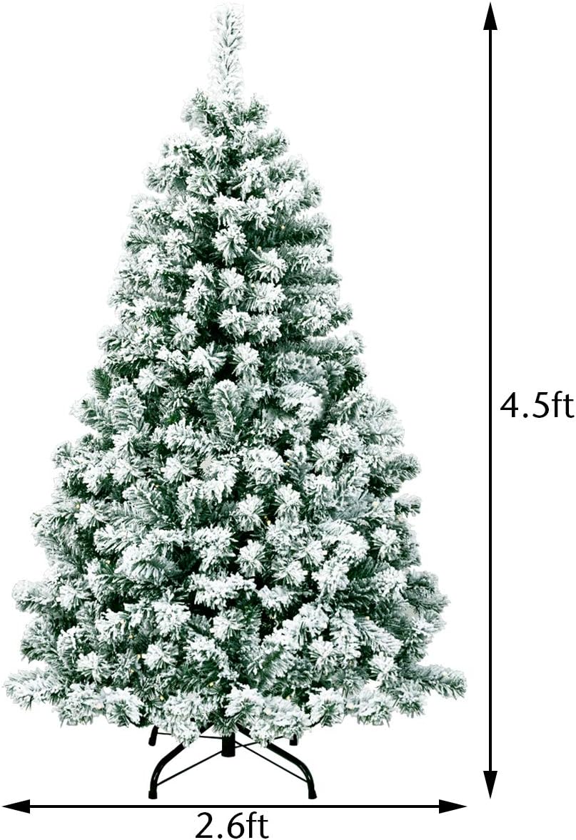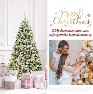 - 🎄Full-body Pre-lit Snow Flocked Xmas Tree: Crafted with 1346 branch tips and snow flocked leaves, this 7.5FT Christmas tree is leafy and elegant. It will create a unique wintry feel, leaving you with the sensation that it is a real tree. In addition, this Xmas tree is equipped with 550 warm LED lights that will bring a festival glow to your home.