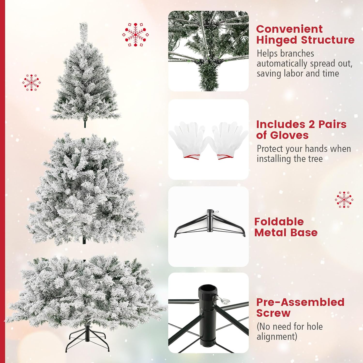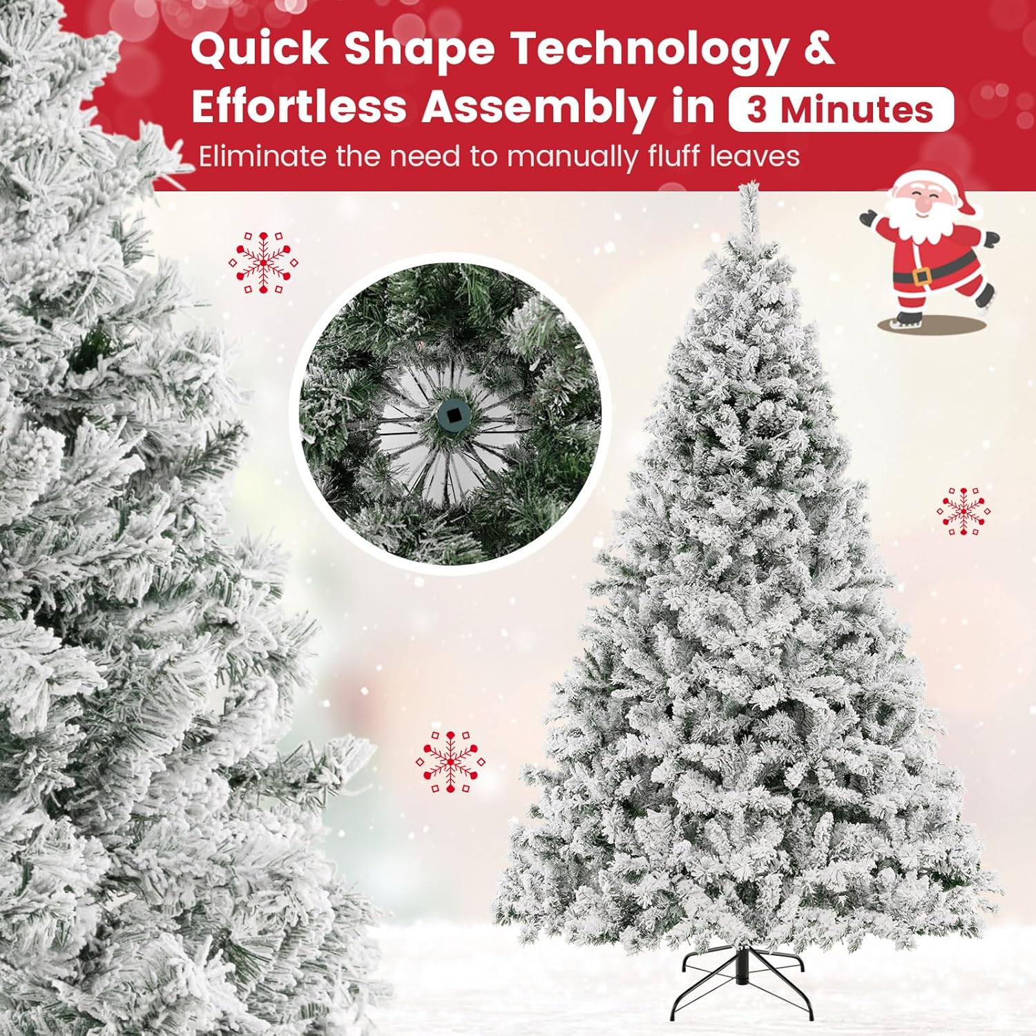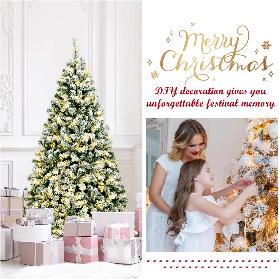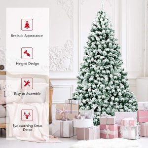 - 🎄Eye-Catching Addition for Any Place: Snow flocked leaves create a unique wintry feel, making this 7.5FT Christmas tree an eye-catching addition for any place. You can either put it at home to strengthen Christmas atmosphere and celebrate Christmas with family members pleasantly, or put it in shops to attract the attention of customers.