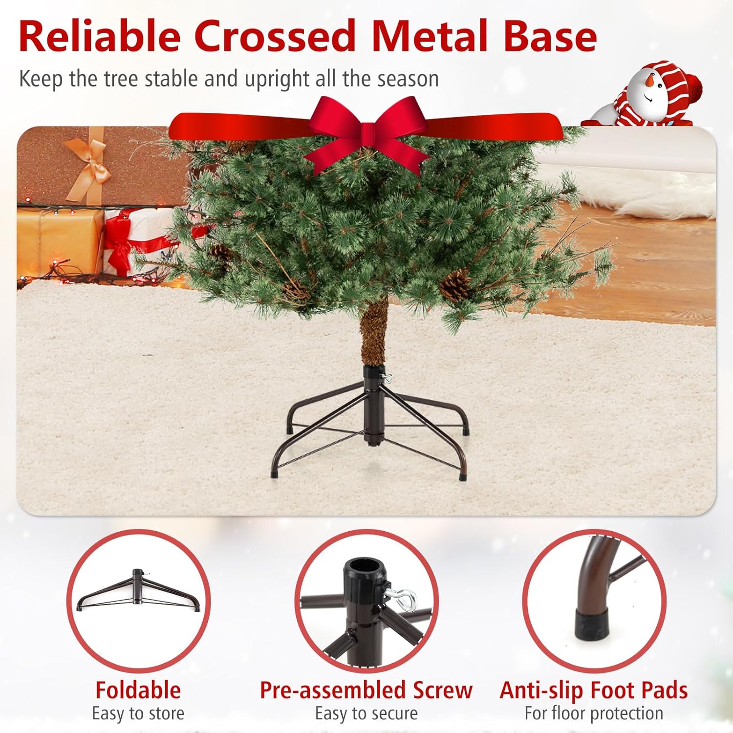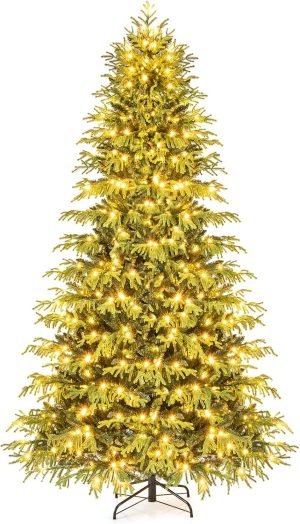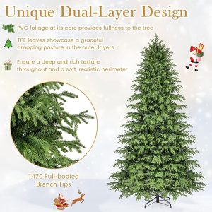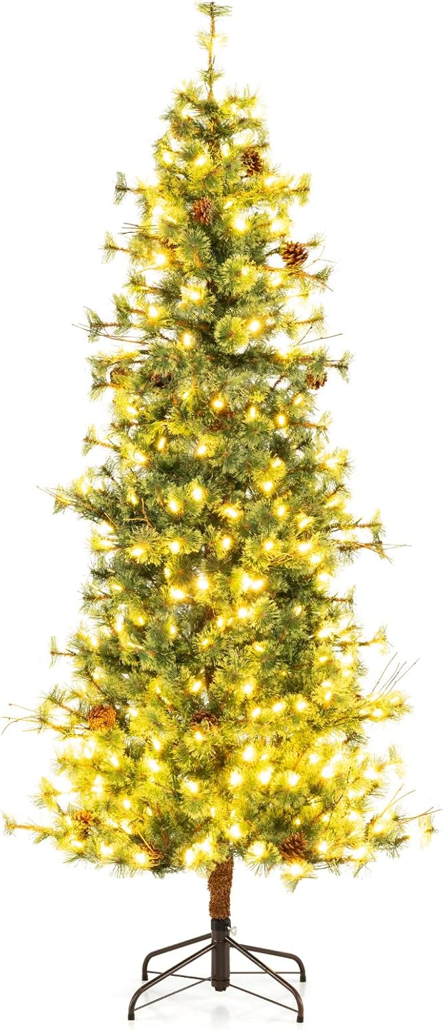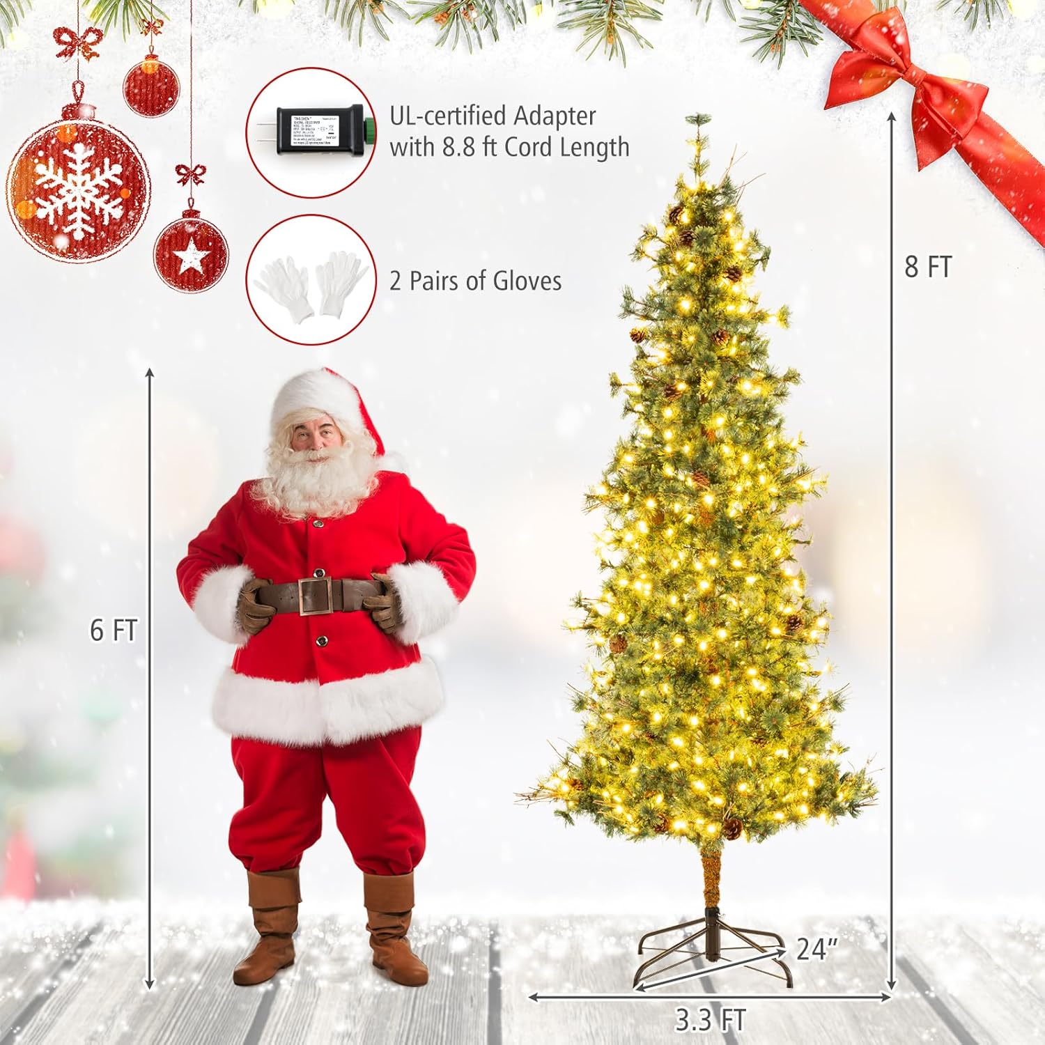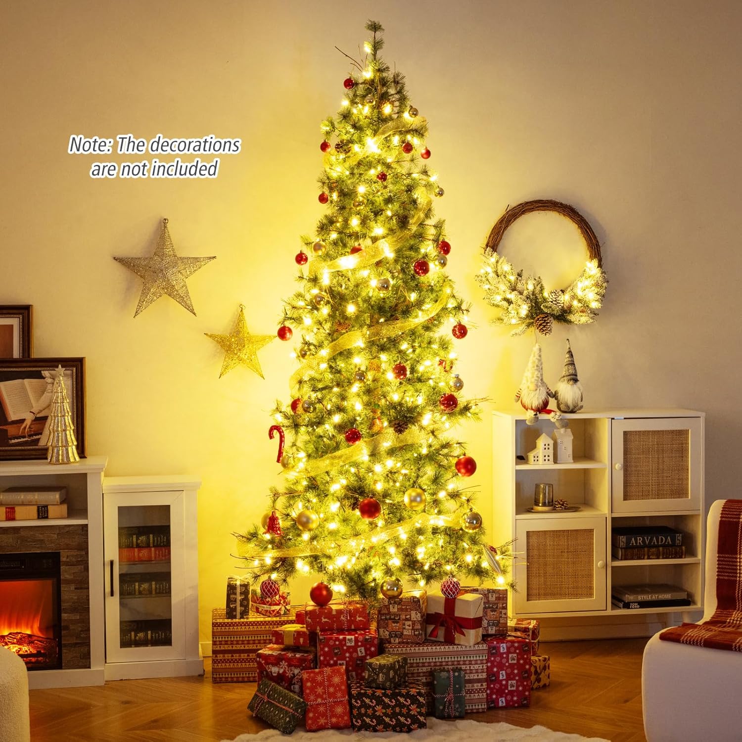 Goplus 8 FT Pre-Lit Artificial Christmas Tree, Hinged Full Xmas Tree with 1470 PVC & Soft TPE Branch Tips, 470 Warm White LED Lights, Foldable Metal Stand, Home Office Holiday Decoration