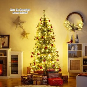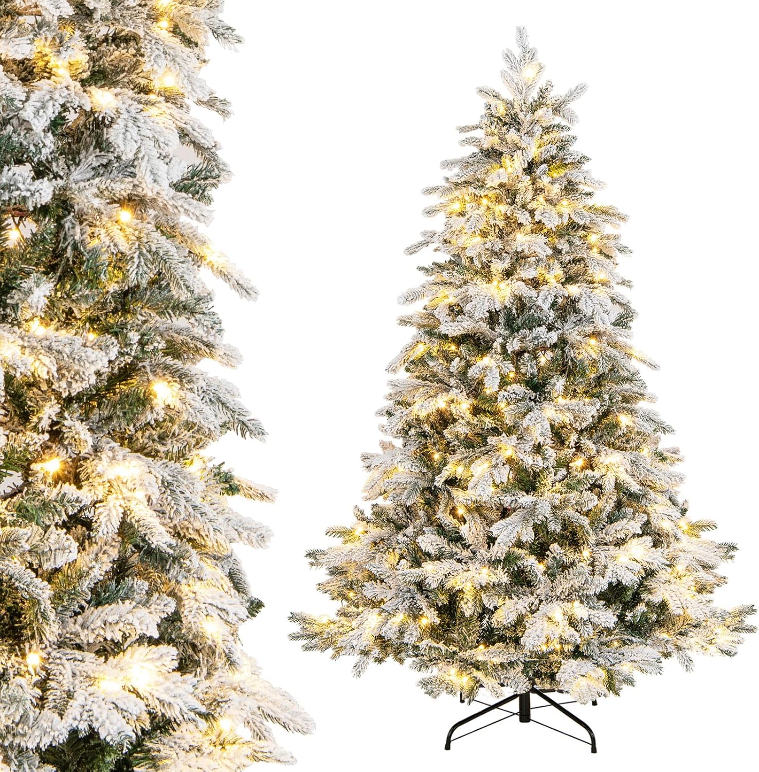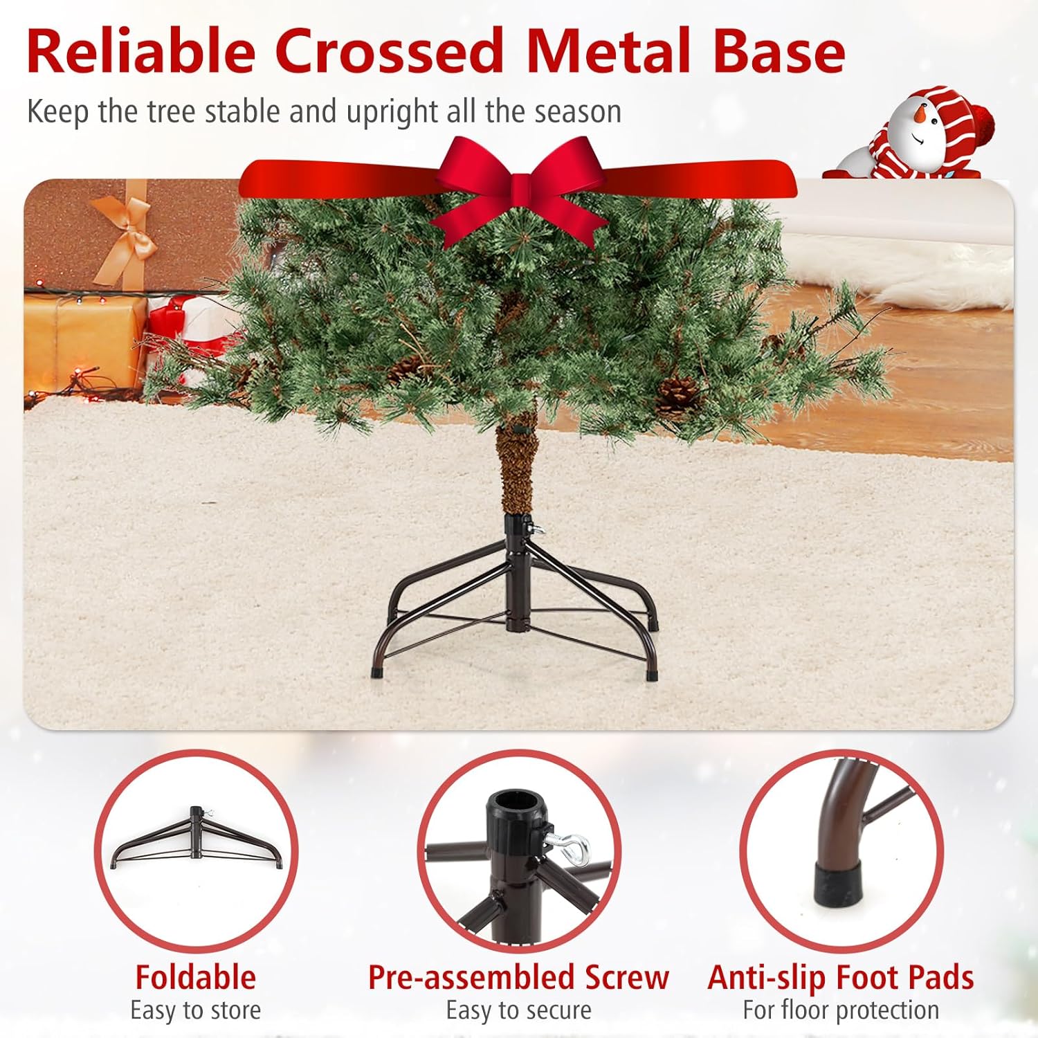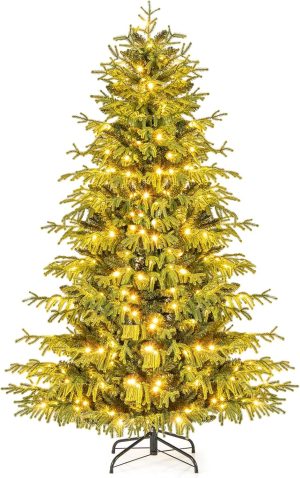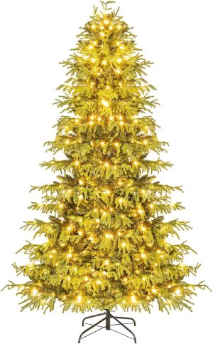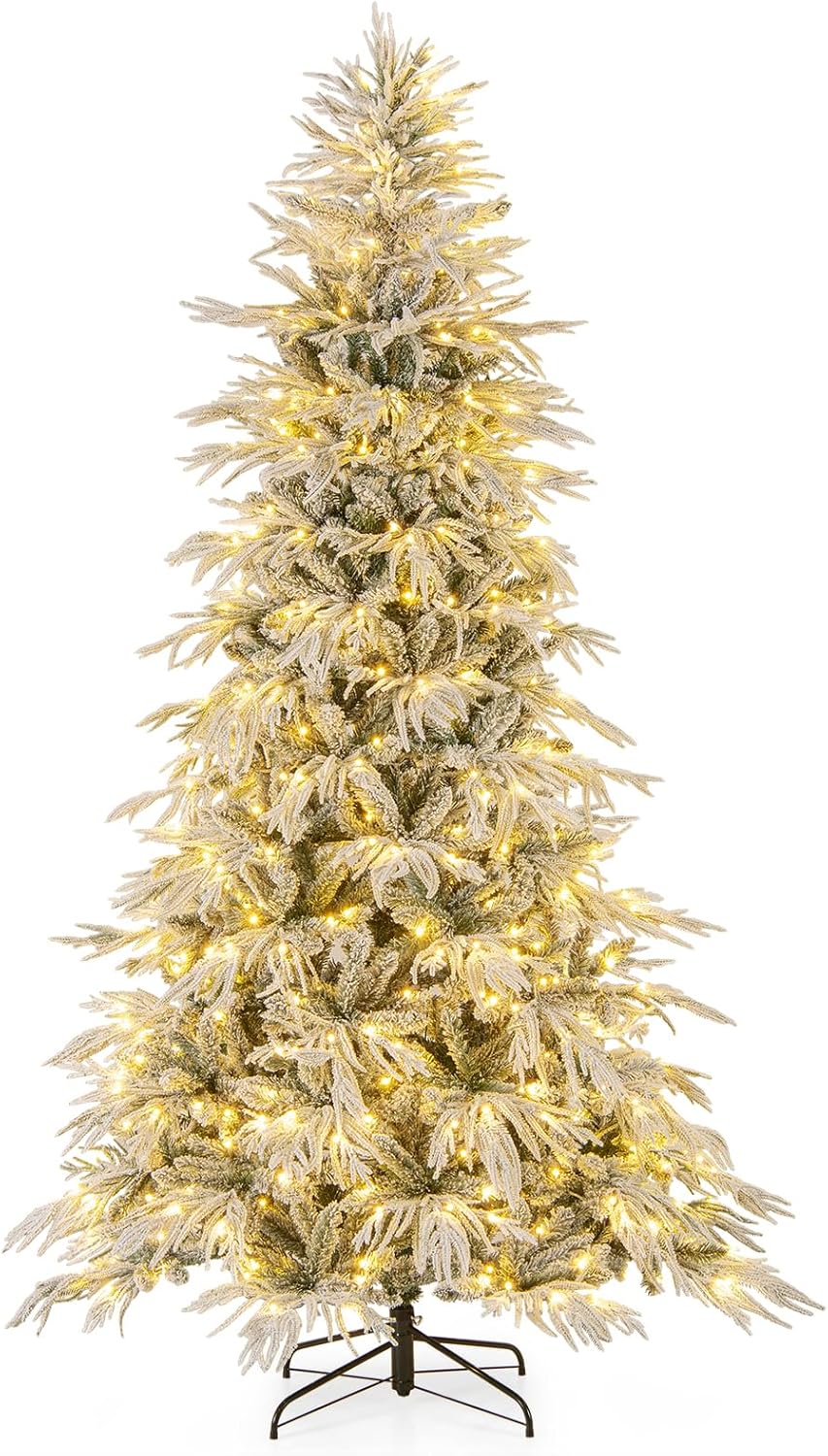 Goplus 8 FT Pre-Lit Artificial Christmas Tree, Hinged Full Xmas Tree with 1470 PVC & Soft TPE Branch Tips, 470 Warm White LED Lights, Foldable Metal Stand, Home Office Holiday Decoration
