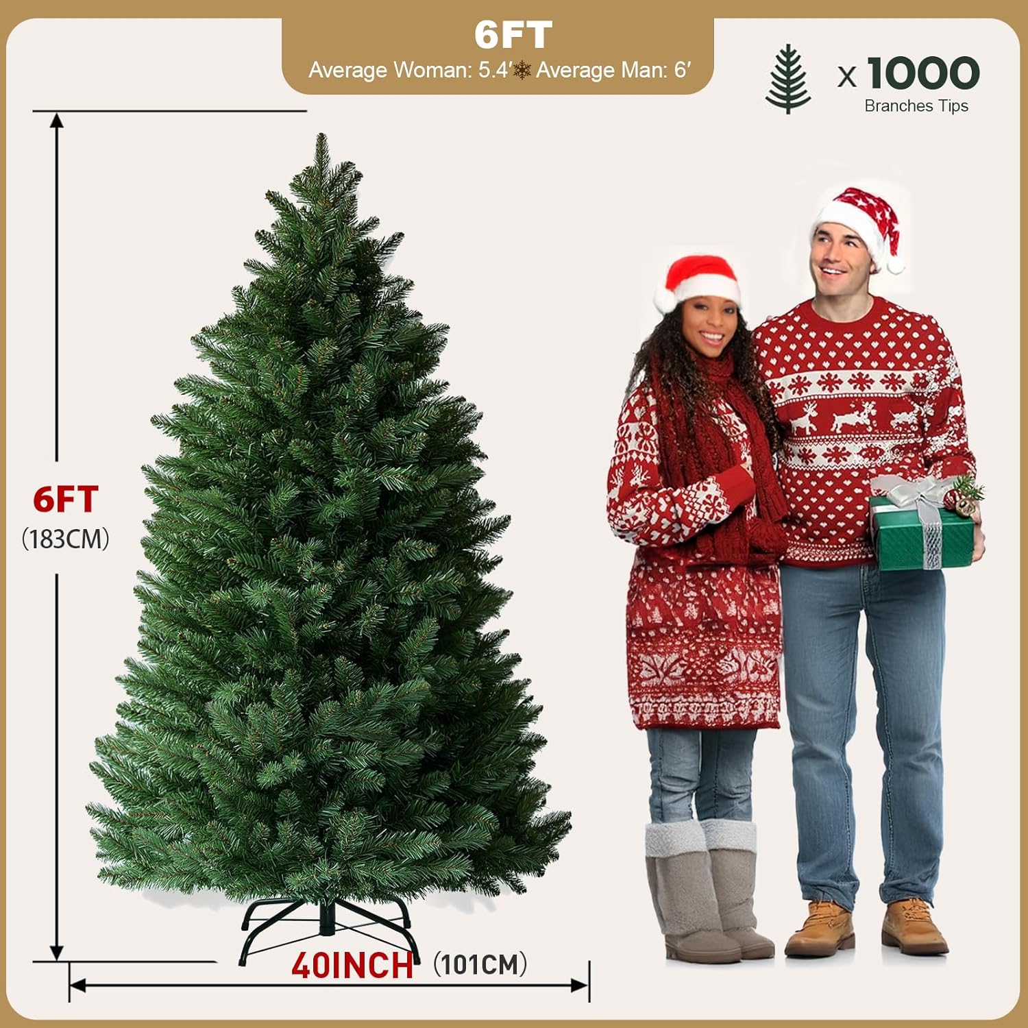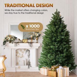 - CLASSIC PINE TREE: 6 feet tall, 40 inches in base diameter. Featuring 1000 branch tips for remarkable realism, this christmas tree can be easily fluffed and shaped for a splendid display, provides more space to showcase your ornaments