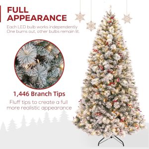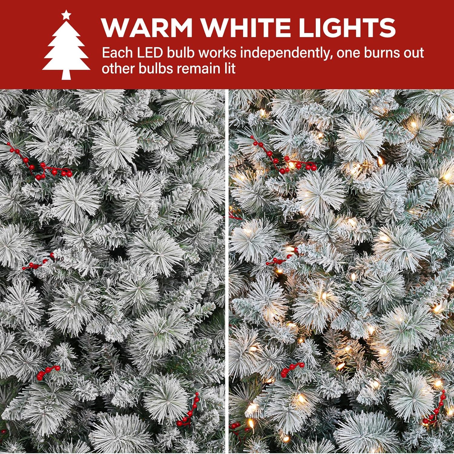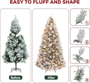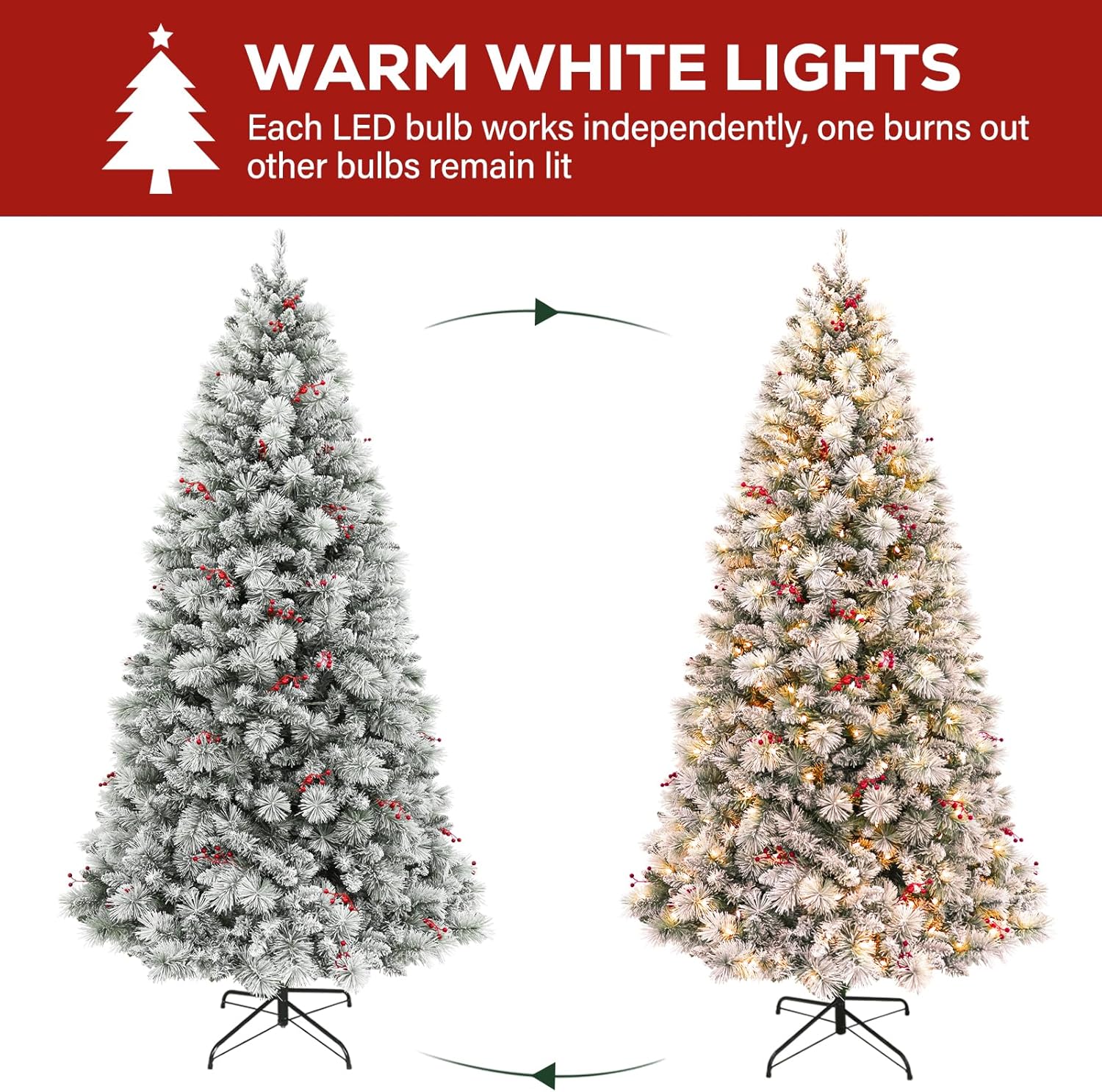 - NATURAL & FULL LOOK: The 6 ft prelit flocked christmas tree boasts 1032 branch tips for a full look. Snow sprinkled branch tips and is trimmed with clusters of berries create a unique wintry feel, pre-strung with 250 warm white lights emitting a warm natural glow. The tree also provides abundant space to showcase your favorite holiday ornaments.