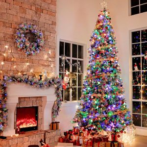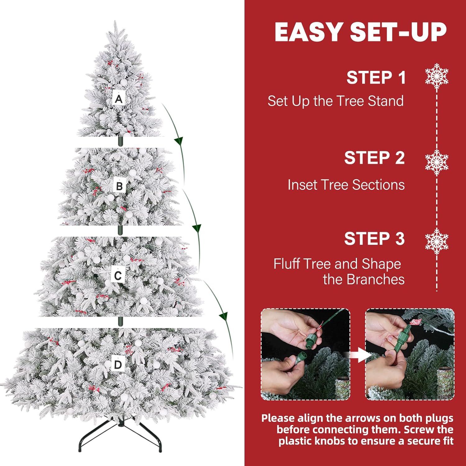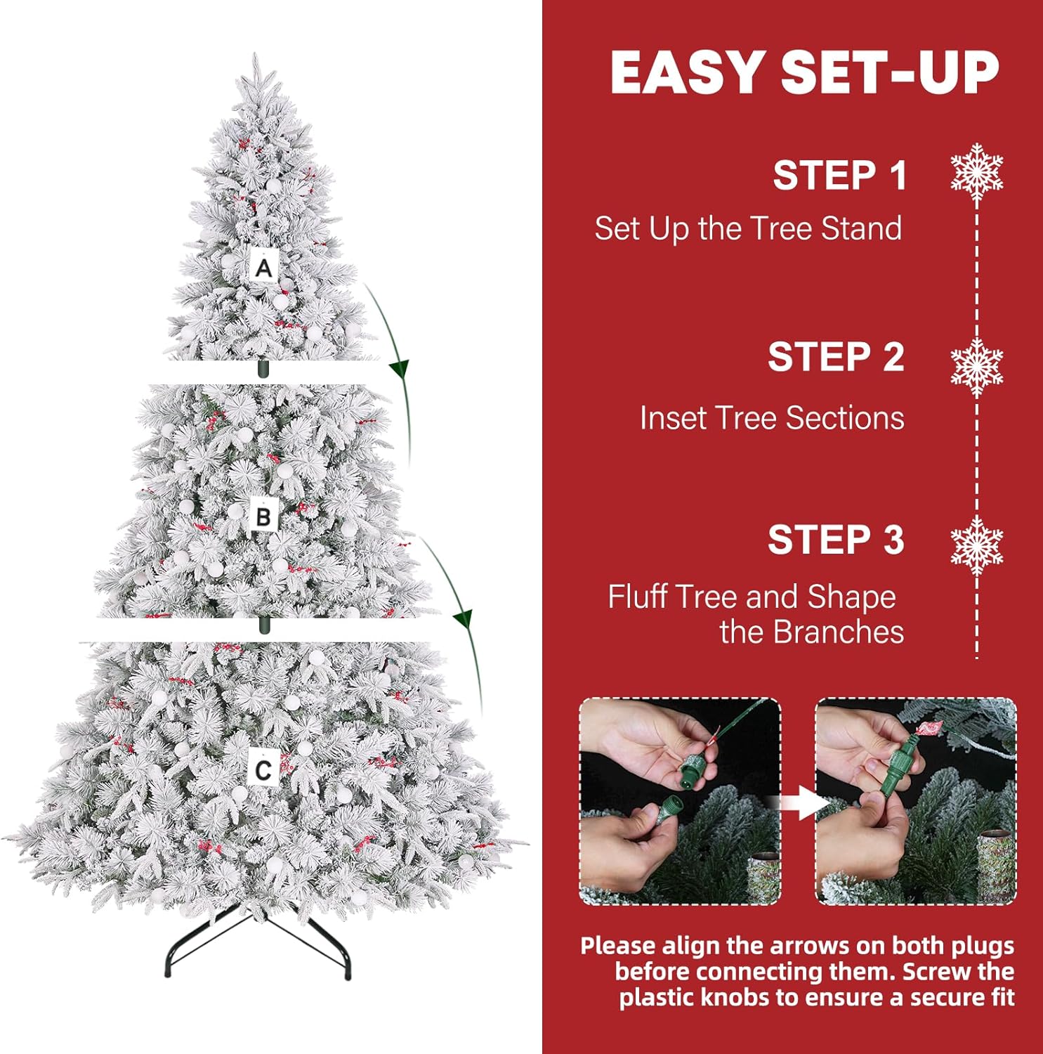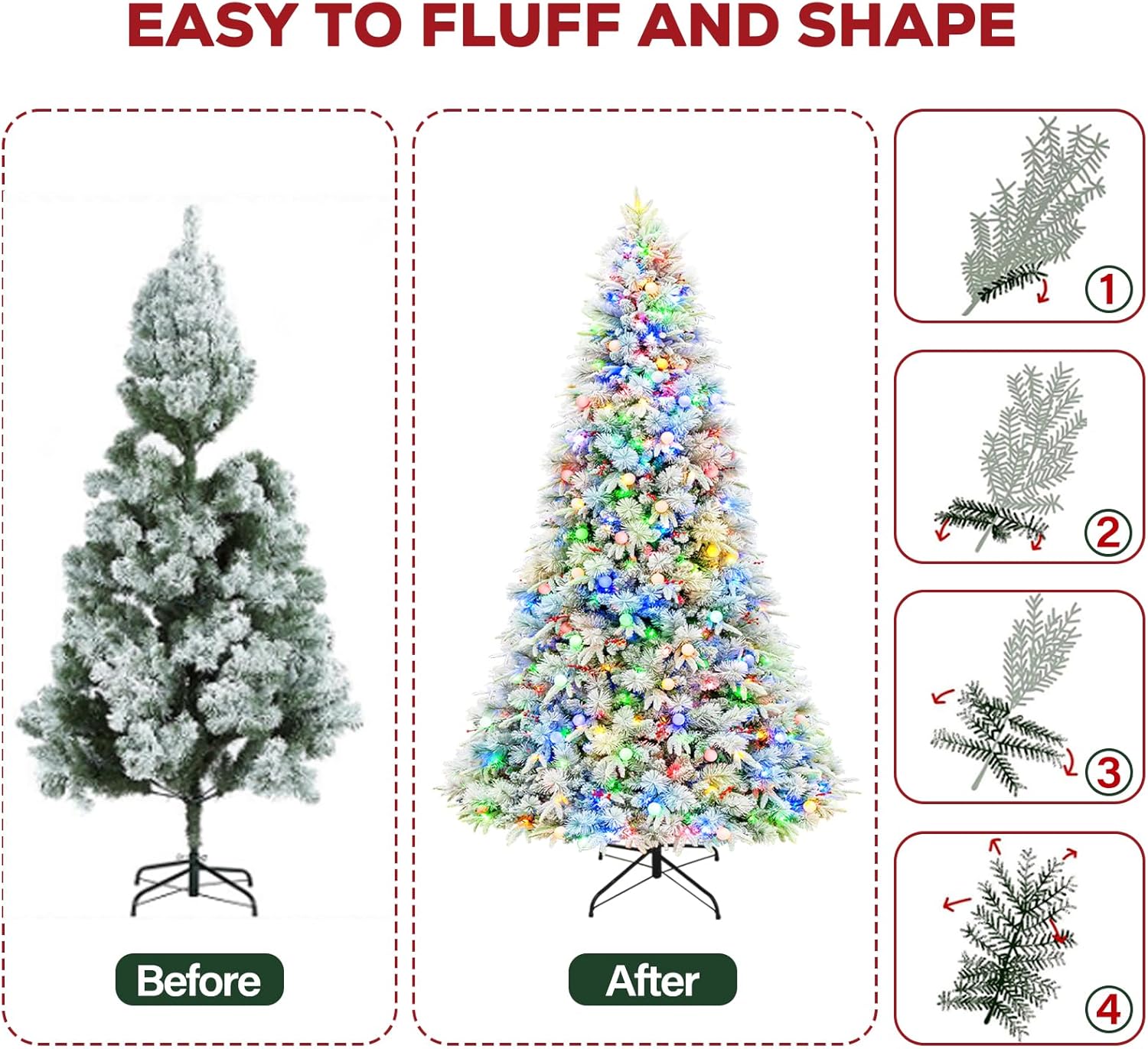 Hykolity 7.5 ft Prelit Flocked Christmas Tree, 450 Multicolor LED Lights, Artificial Christmas Pine Tree with Red Berries, 1608 PE&PVC Branch Tips, Metal Stand and Hinged Branches, 10 Modes