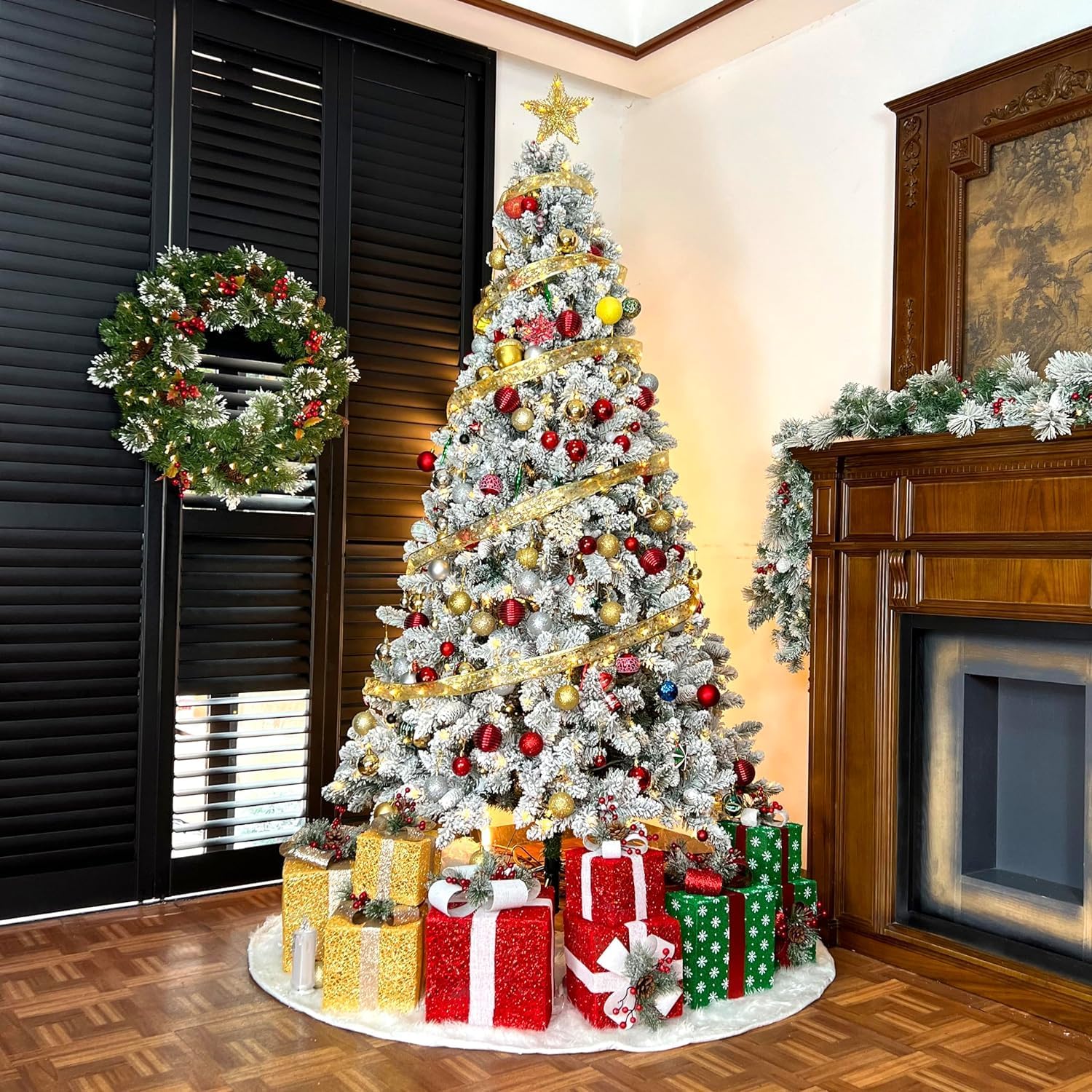 - NATURAL & FULL LOOK: The 7.5 ft lush evergreen snow flocked Christmas tree boasts 1446 branch tips for a full look, snow sprinkled branch tips create a unique wintry feel. Pre-strung with 450 warm white LED lights emitting a warm natural glow. The tree also provides abundant space to showcase your favorite holiday ornaments.