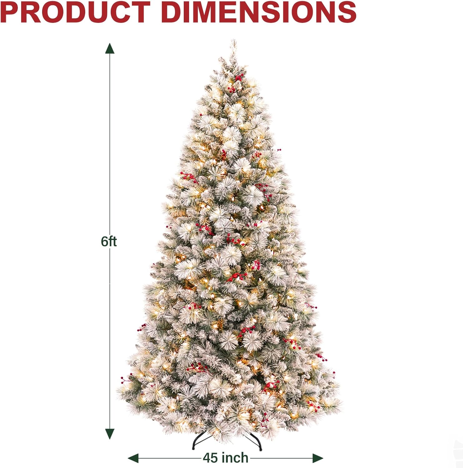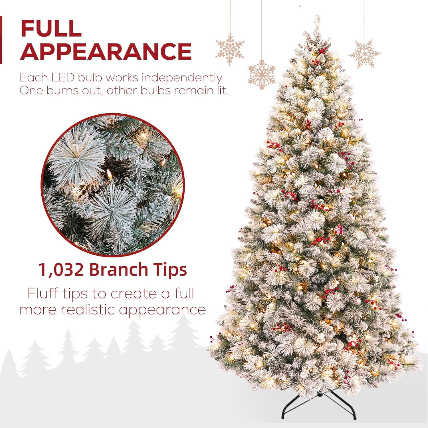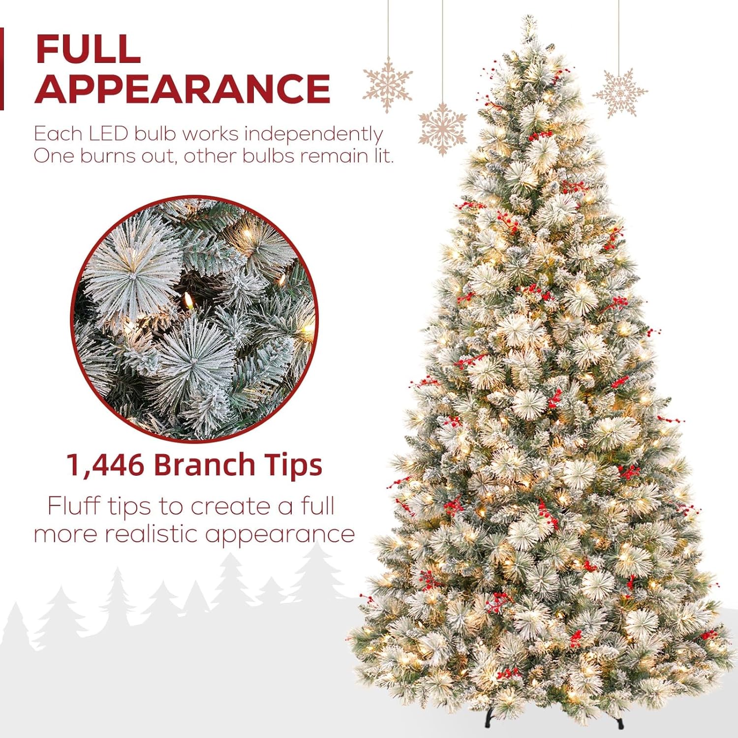 - NATURAL & FULL LOOK: The 7.5 ft flocked christmas tree boasts 1446 branch tips for a full look, pre-strung with 450 warm white lights emitting a warm natural glow. Features snow sprinkled branch tips and is trimmed with clusters of berries. The north valley spruce tree also provides abundant space to showcase your favorite holiday ornaments.