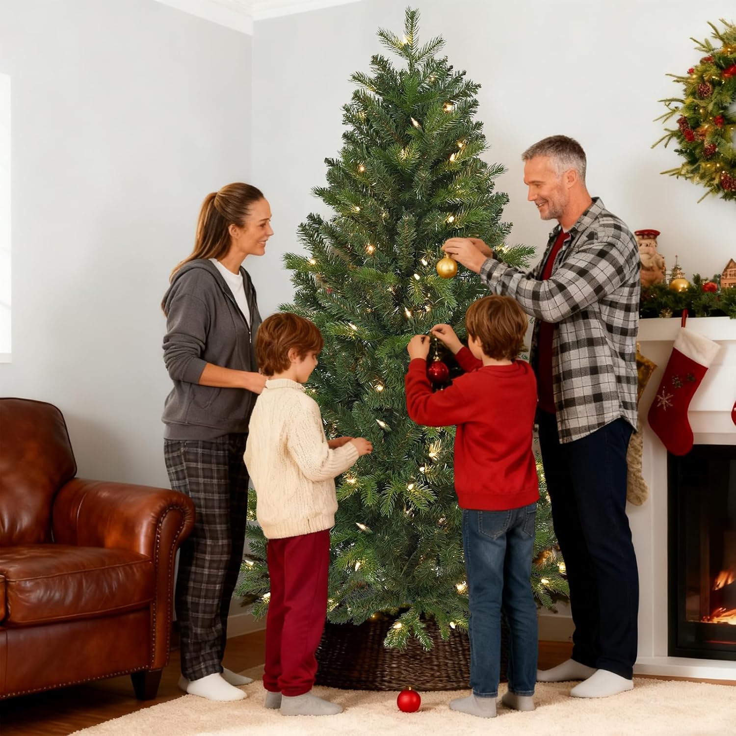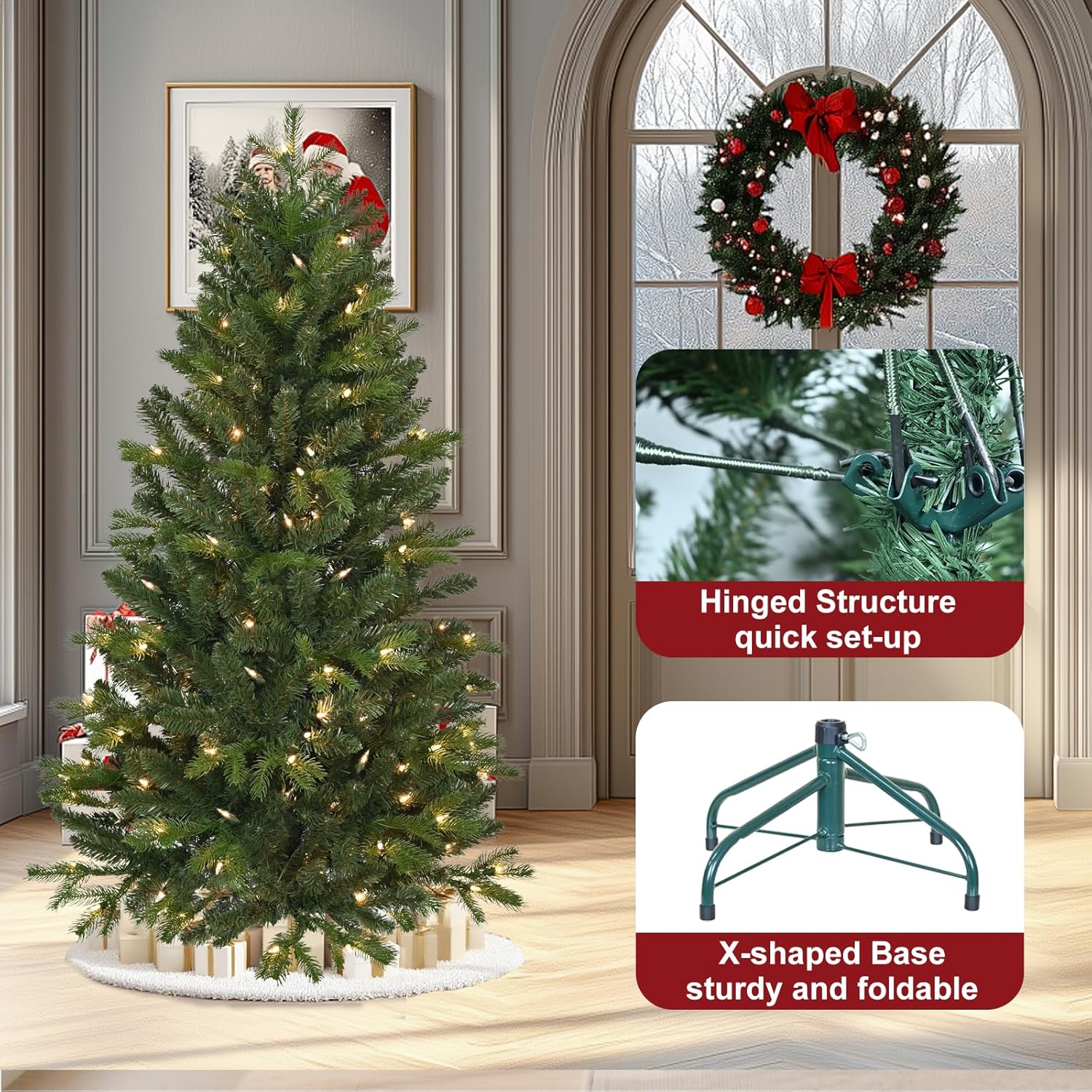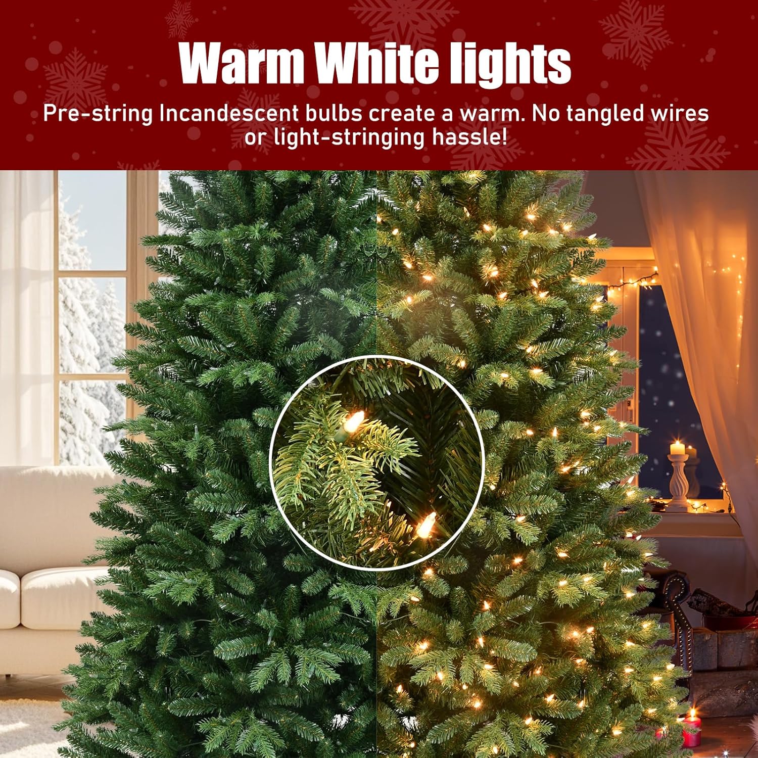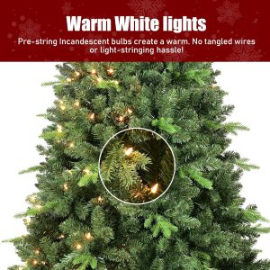 - PRE-STRUNG LIGHTS: Instantly light up your 4 ft pre-lit green Christmas tree! 200 pre-string incandescent bulbs create a warm, festive glow—just plug in for a perfect snowy-season atmosphere. No tangled wires or light-stringing hassle!