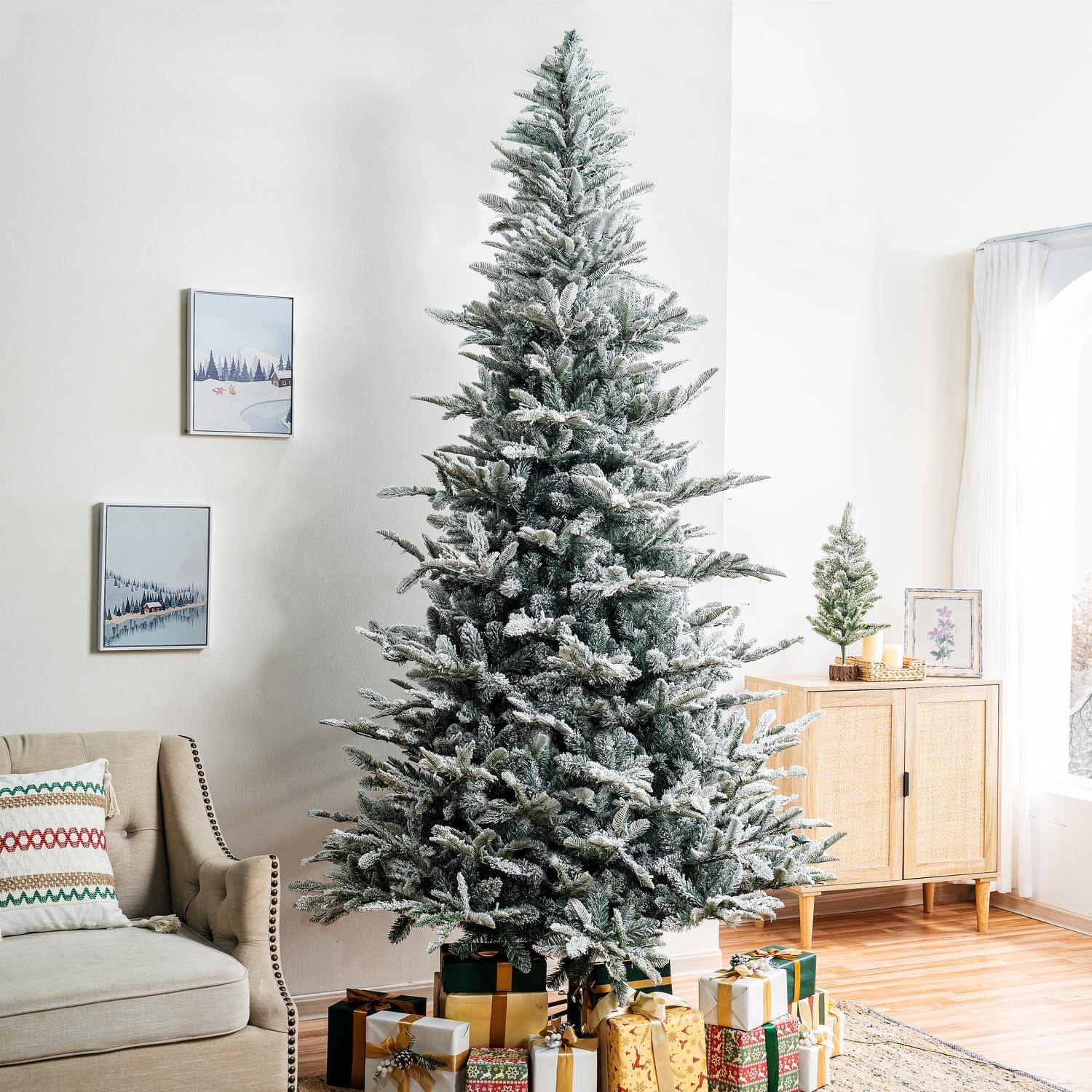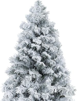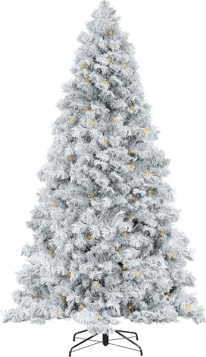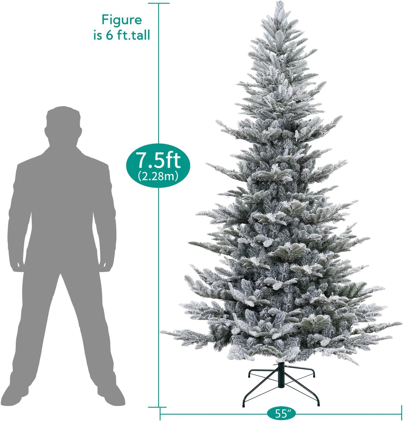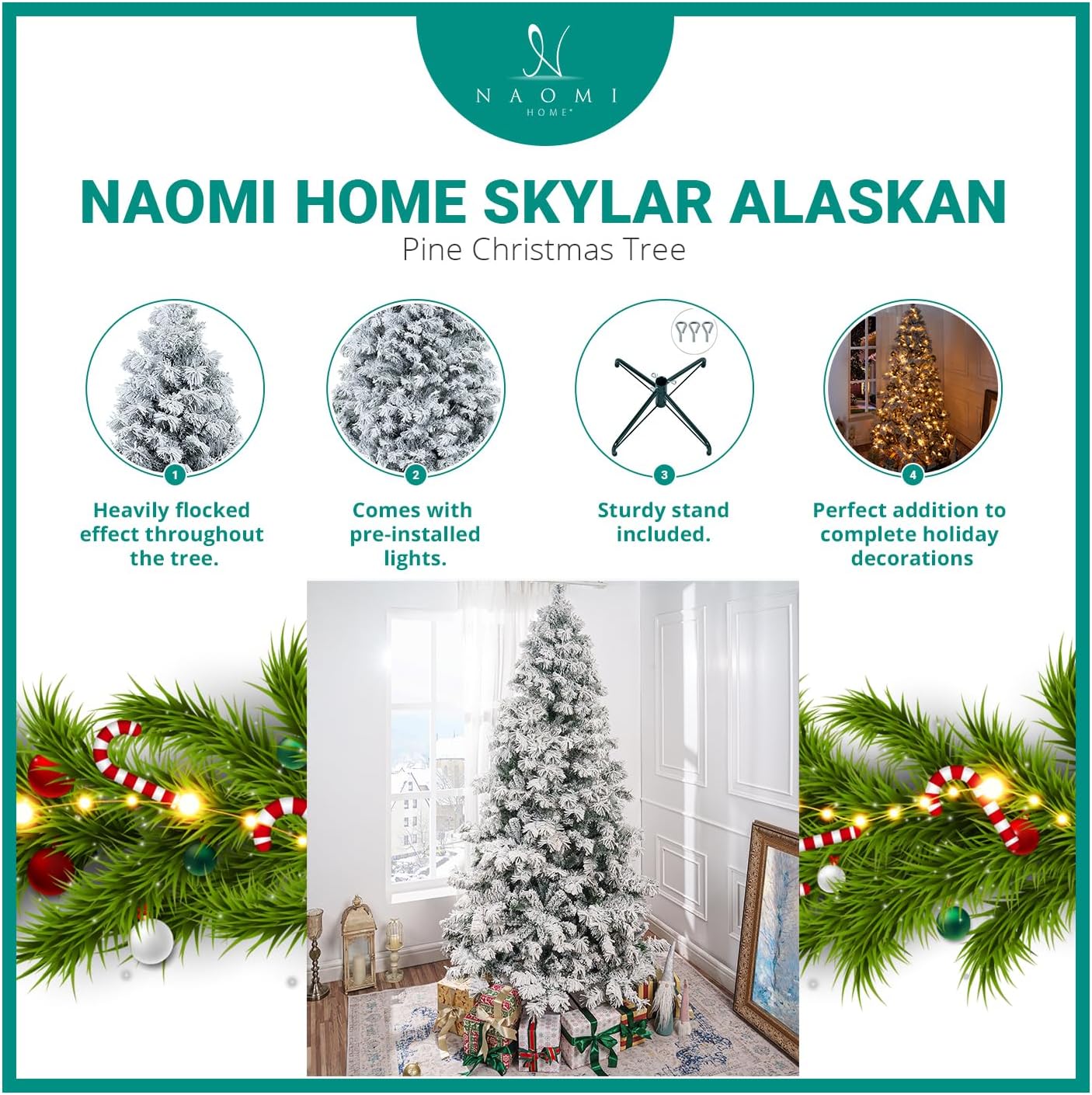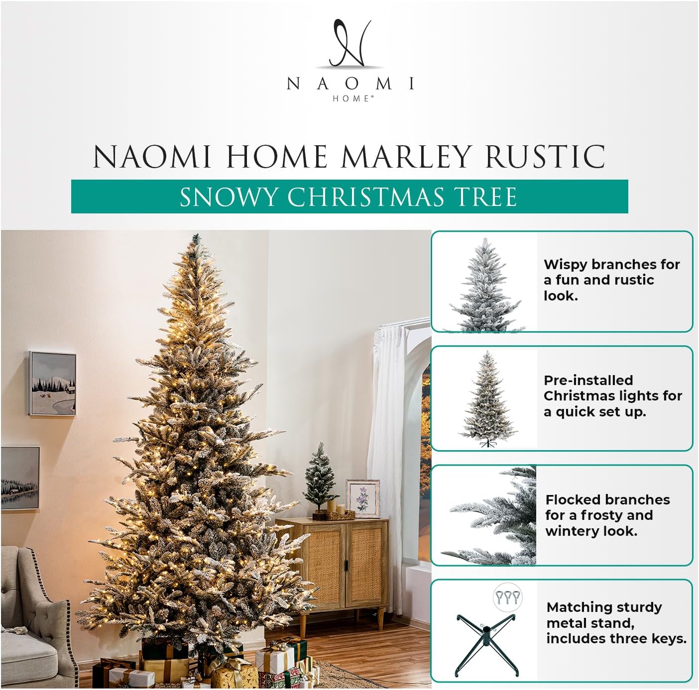 Naomi Home 7.5ft Snow Flocked Christmas Tree with Lights, Realistic Frosted Christmas Tree Prelit with 892 Branch Tips, 550 Warm Lights and Metal Stand, Aritificial Xmas Tree