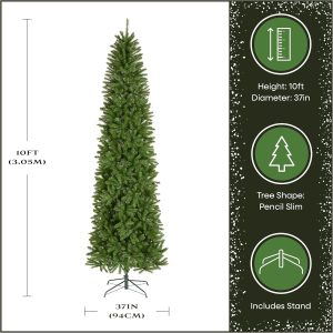 - This Kingswood Fir Slim Artificial Green Christmas Tree is 10 feet tall with a 37 inch base diameter. Featuring hundreds of individually crafted branch tips to create full bodied branches, this tree is designed to look and feel lifelike.