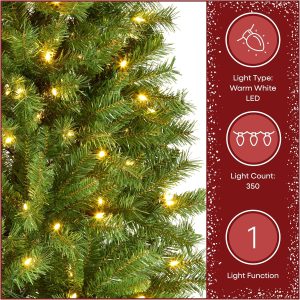 - INCLUDES 350 LED LIGHTS: Holiday tree arrives pre-strung for a convenient set-up with 350 energy-efficient warm white LED Lights that provide a cozy holiday glow and remain lit even if one bulb goes out