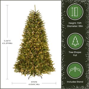 - This Dunhill Fir Full Artificial Green Christmas Tree is 7.5 feet tall with a 59 inch base diameter. Featuring hundreds of individually crafted branch tips to create full bodied branches, this tree is designed to look and feel lifelike.