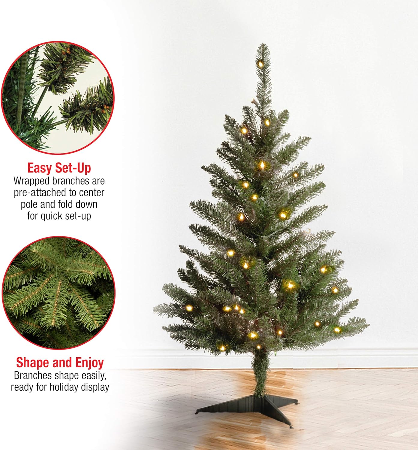 - This tree features pre-attached, hinged branches that drop down for a simple set-up and fold back in for quick and convenient storage. Set aside 45-60 minutes to properly shape the tree by peeling back the branches and pulling the tips apart.