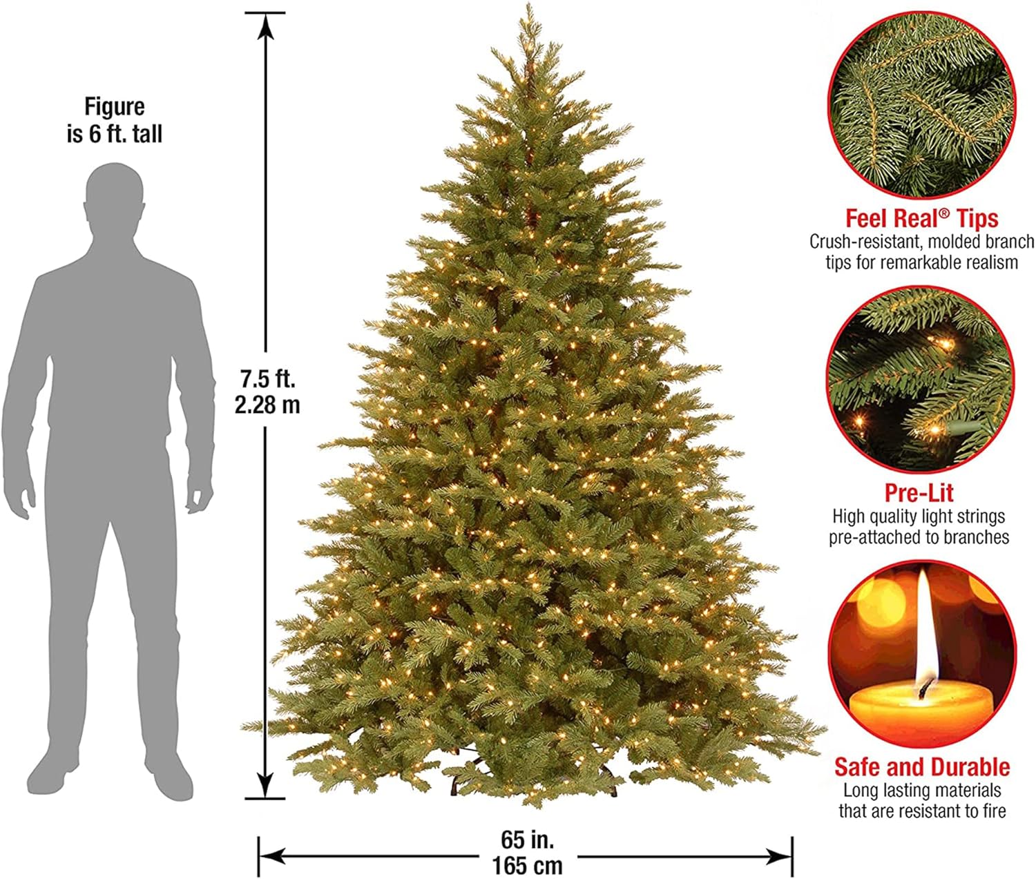 - This Nordic Spruce Full Pre-Lit Artificial Green Christmas Tree is 7.5 feet tall with a 65 inch base diameter. Featuring hundreds of 'Feel Real' individually crafted branch tips to create full bodied branches, this tree is designed to look and feel lifelike.