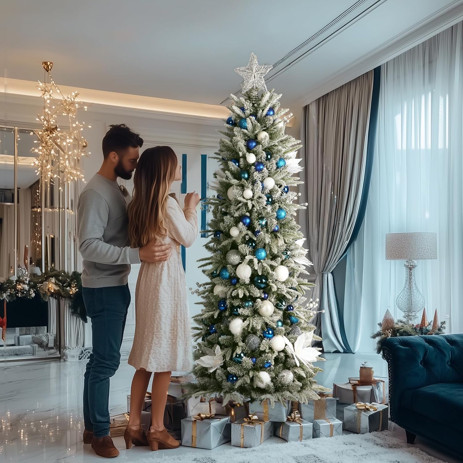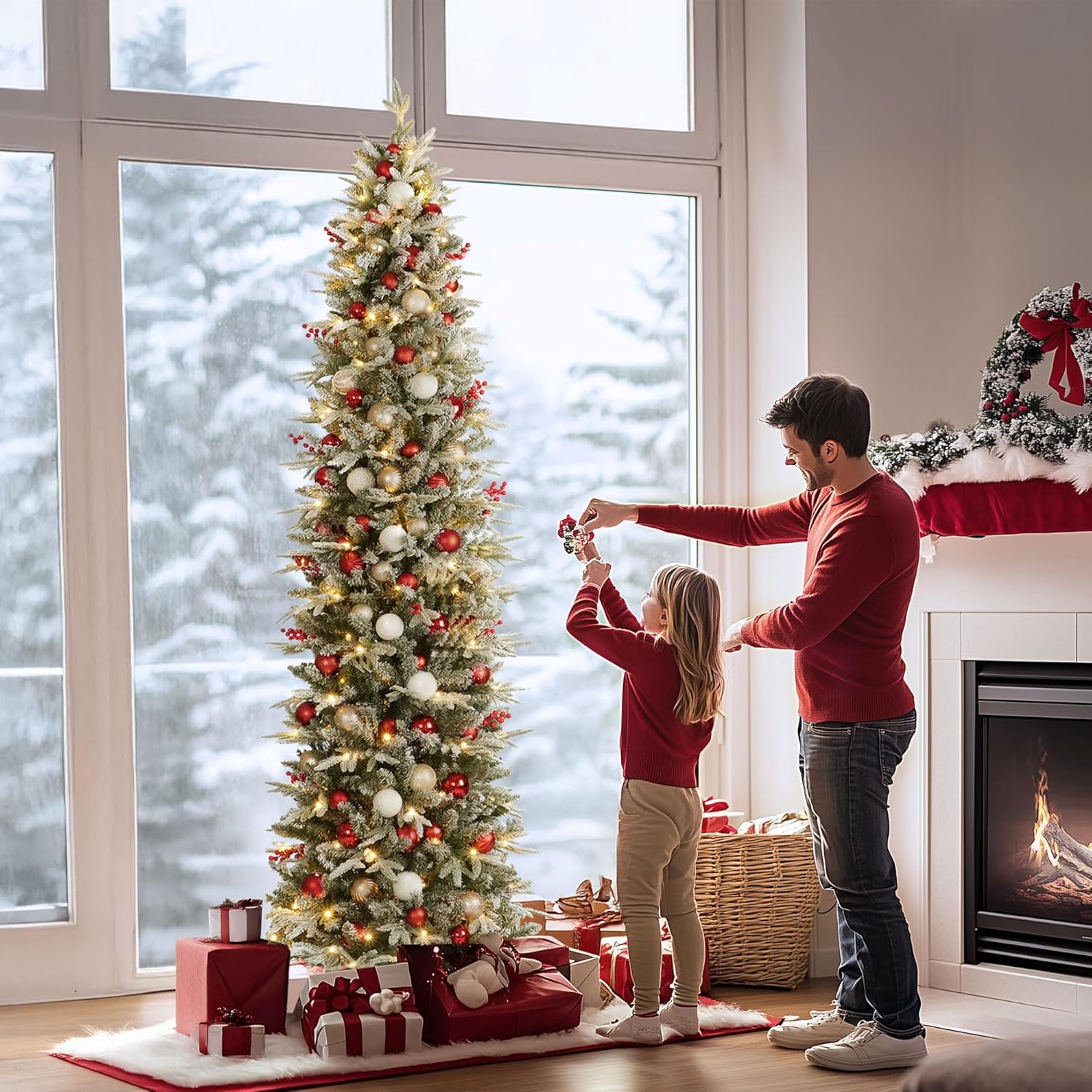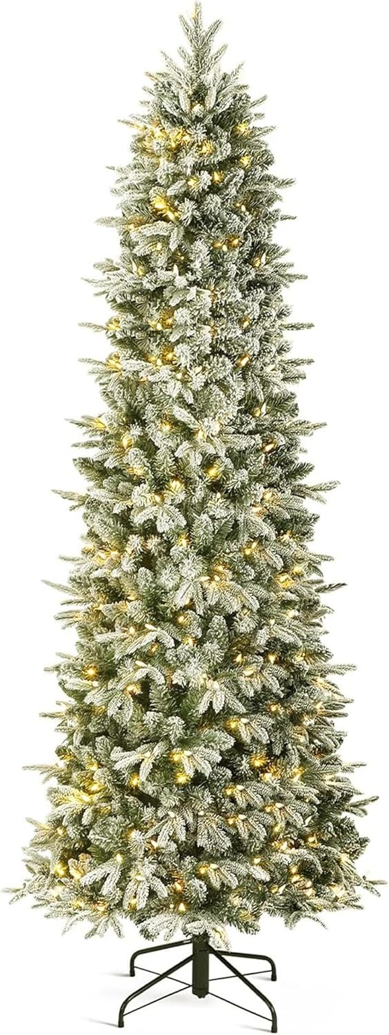 OasisCraft 6FT Pre-lit Artificial Snow Flocked Slim Christmas Tree with 300 LED Lights and 1300 PVC&PE Branch Tips for Home Shops Office Holiday Decoration