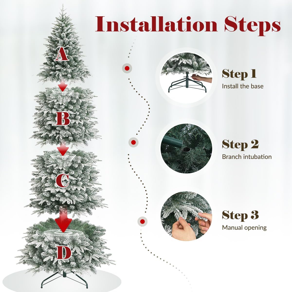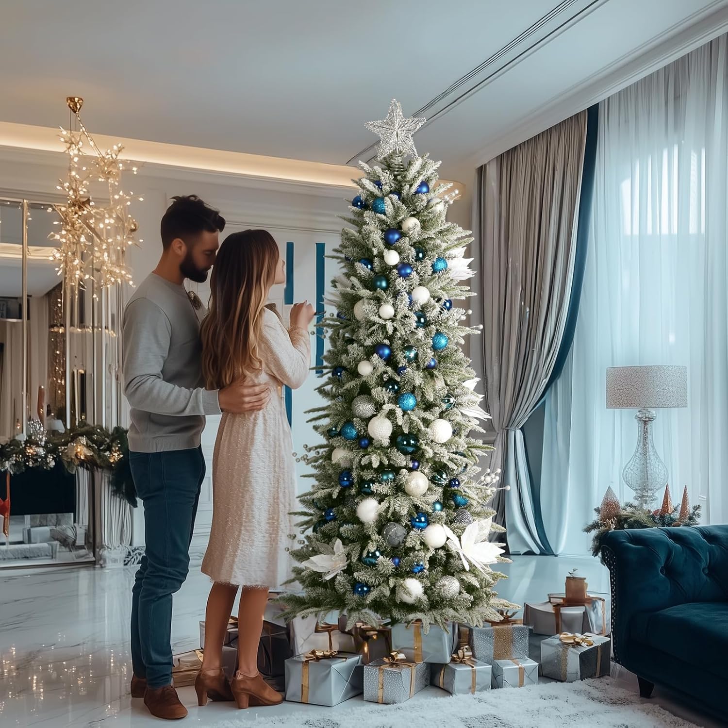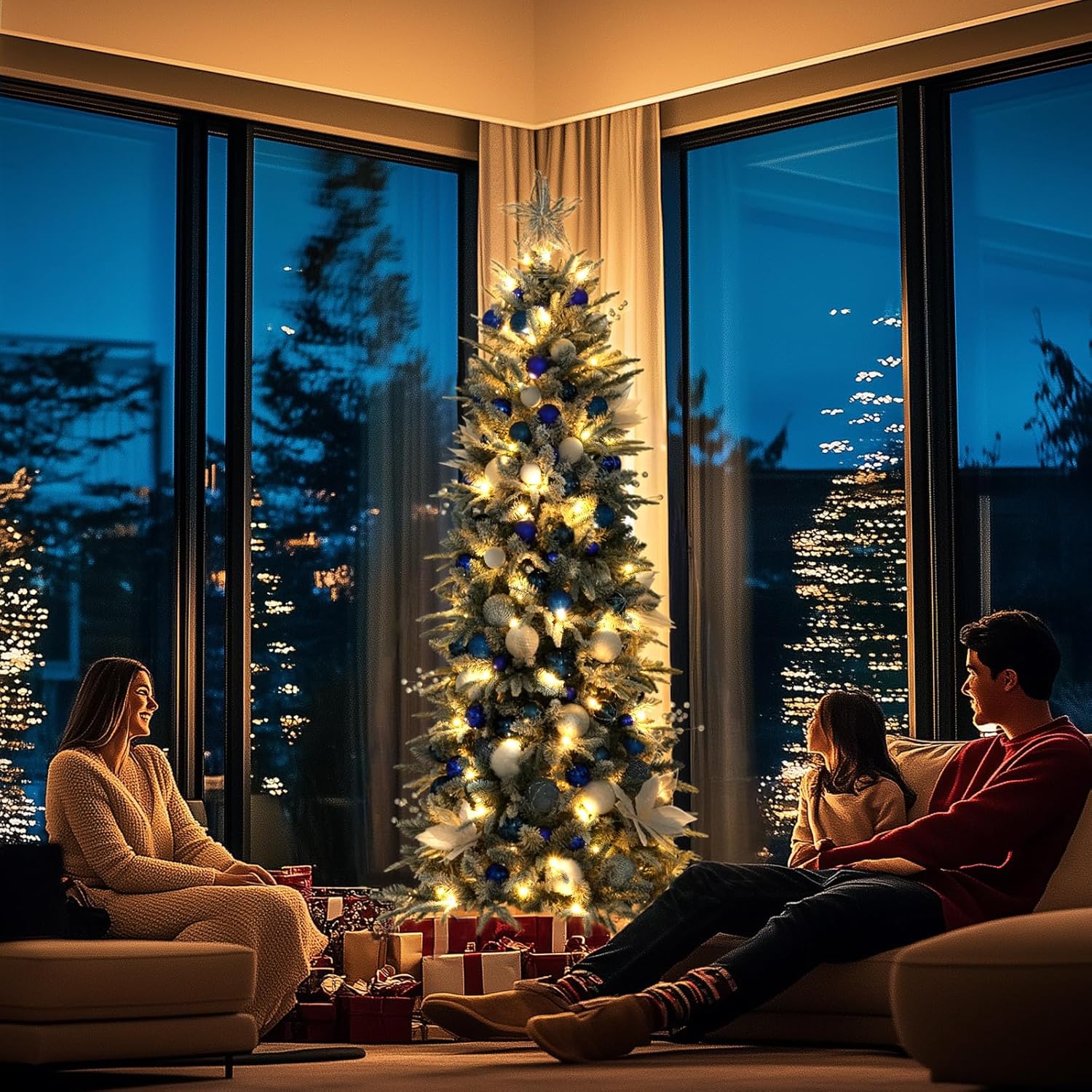 OasisCraft 6FT Pre-lit Artificial Snow Flocked Slim Christmas Tree with 300 LED Lights and 1300 PVC&PE Branch Tips for Home Shops Office Holiday Decoration