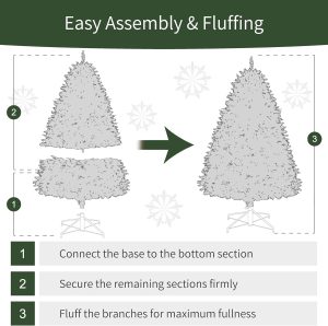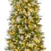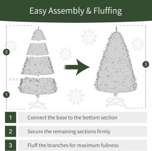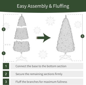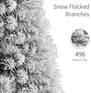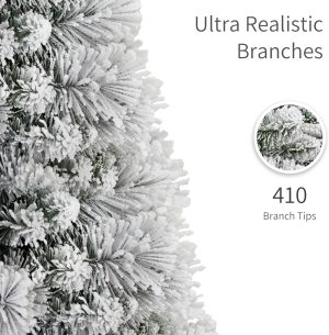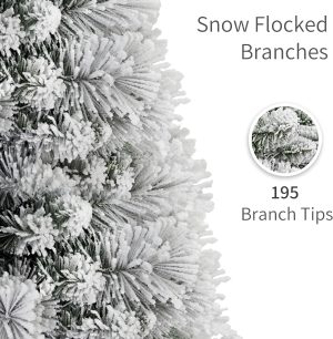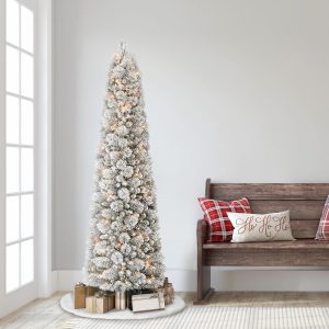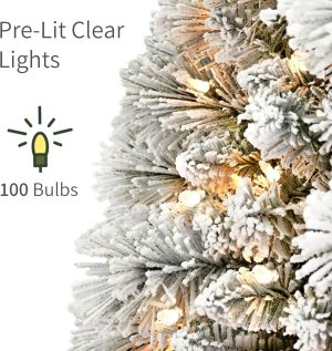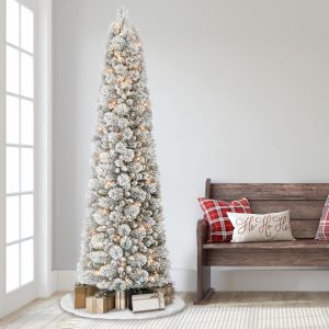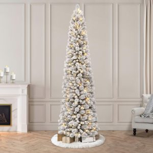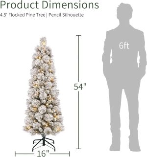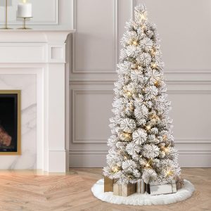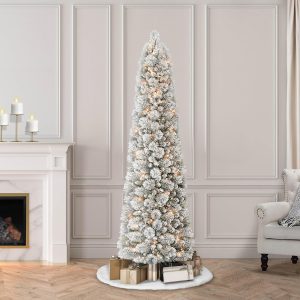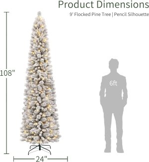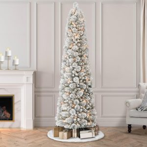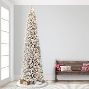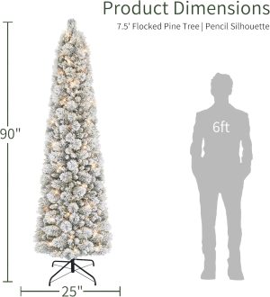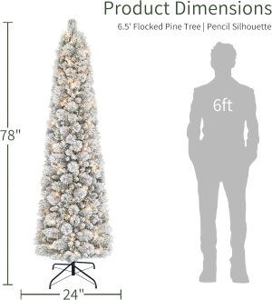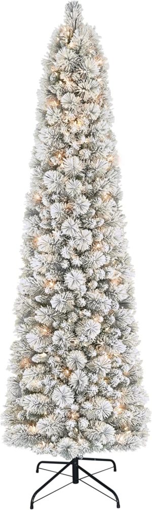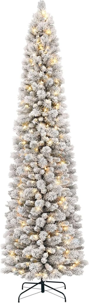 Puleo International 6.5ft Pre-Lit Flocked Portland Pine Pencil Christmas Tree with 300 Clear Lights, 410 Realistic Dense Snow Flocked Branch Tips, Easy Setup Artificial Trees with Sturdy Metal Stand