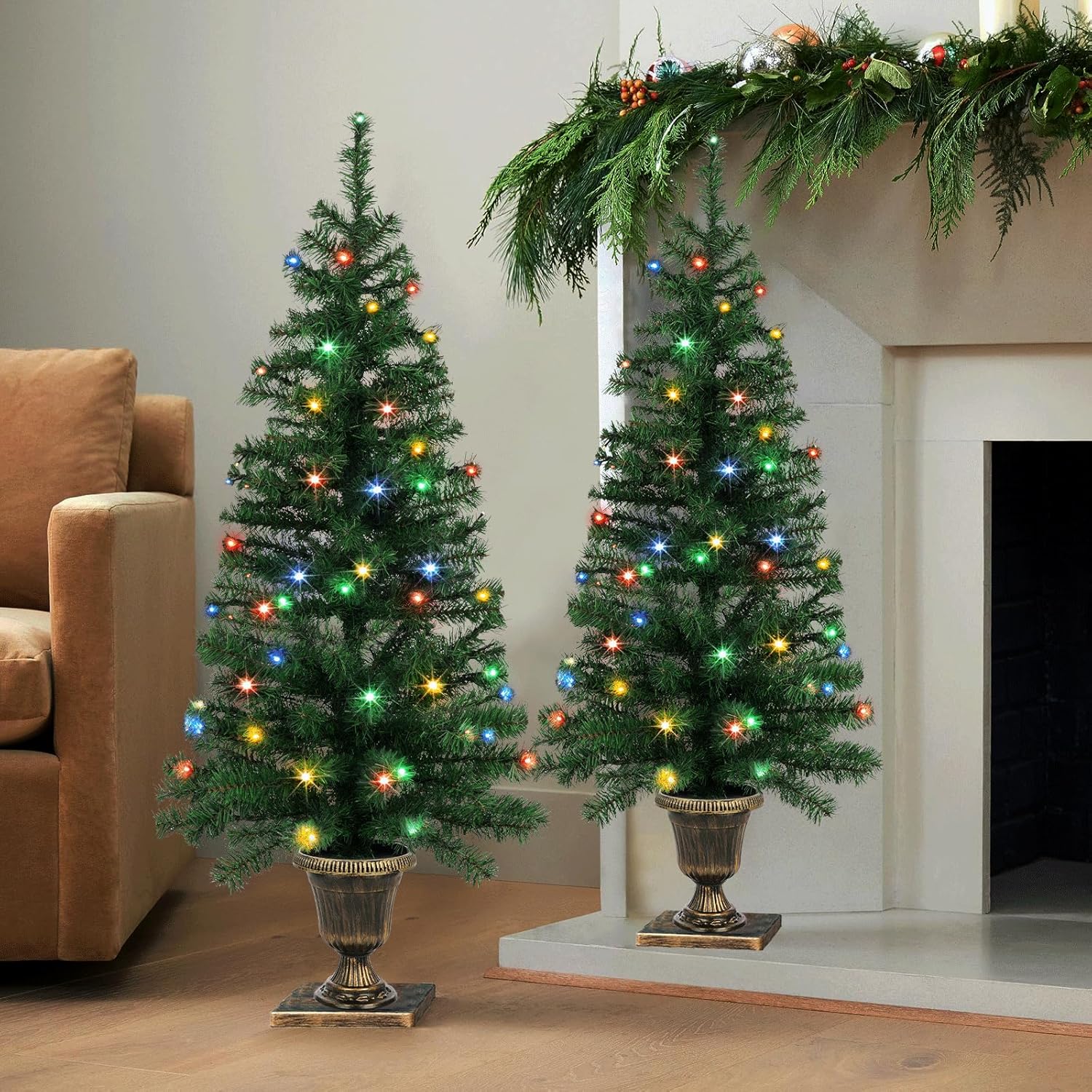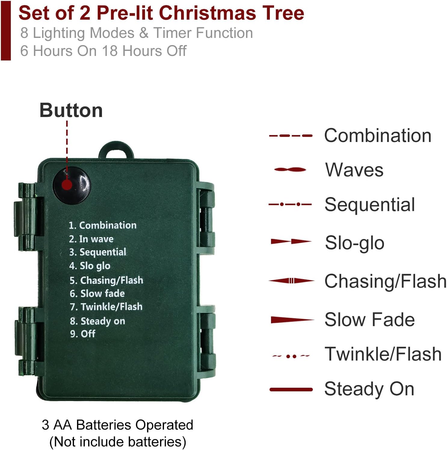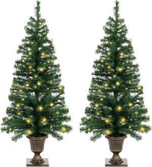 - Pre-Lit Christmas Trees: Pre-strung 100 warm white LED Lights for each tree, it brings the holiday spirit with this beautiful Christmas tree, no need to weave the lights by yourself. Waterproof battery box suit for indoor and outdoor use. 3 X AA batteries not included.