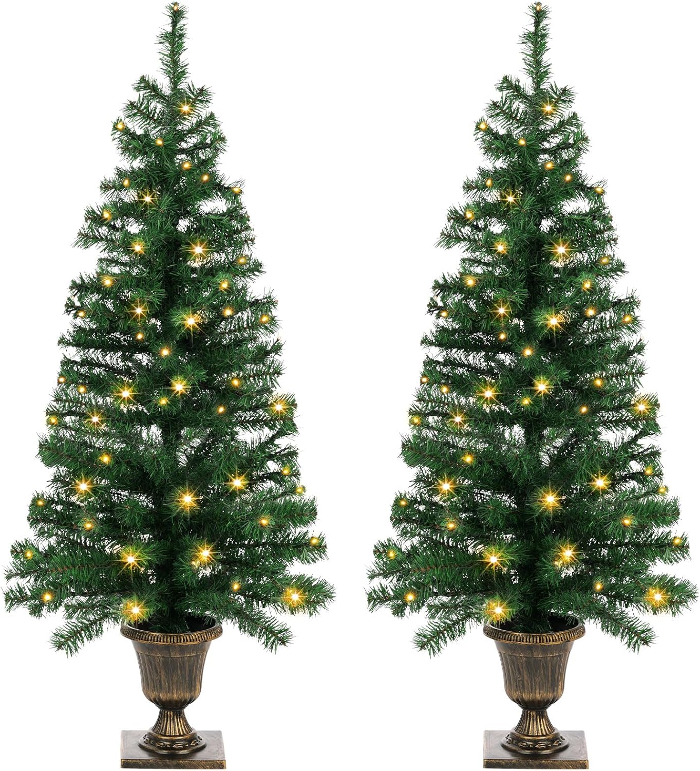 - Set of 2 Potted Trees: Each 4 ft tall artificial tree come with urn-style base, and it is embossed with angelic designs and finished with brushed bronze paint. Stable plastic urn base can support the whole tree stably and uprightly. Portable design for you to tuck it away with ease.