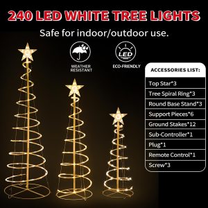 - Extra Large Spiral Tree Set: Our 3 Christmas LED spiral tree lights are 3/4/5 FT tall. Thick mental and PVC frame constitute these beautiful Christmas spiral tree lights which makes romantic atmosphere at your yards for the coming Christmas