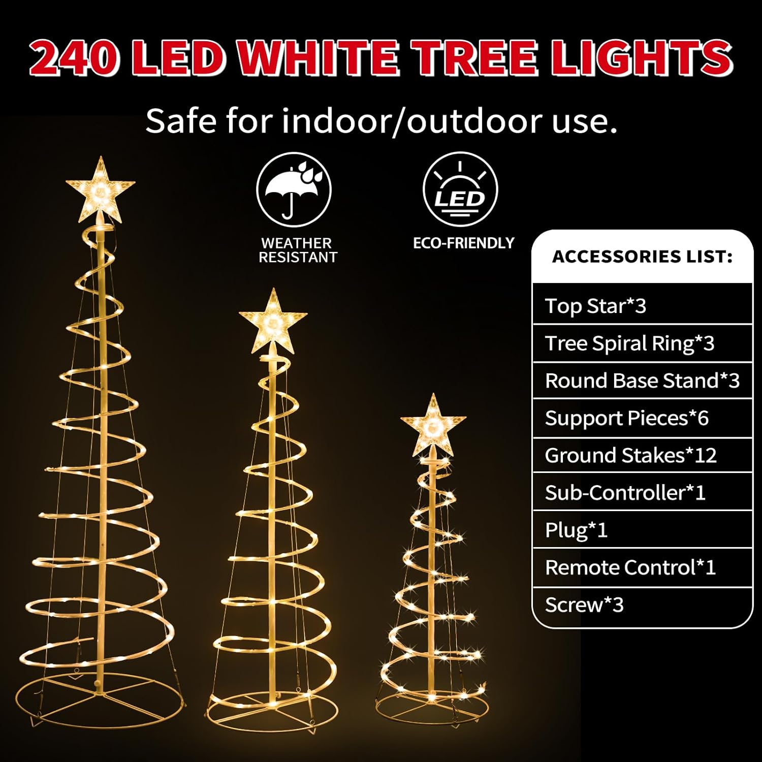 Set of 3 Christmas Decoration Outdoor Spiral Tree, 3/4/5 FT 240 LED Xmas Collapsible Tree Lighted 3D Lights Holiday Display Decorative for Indoor Outdoor Xmas Patio Wedding Decor(Warm White)
