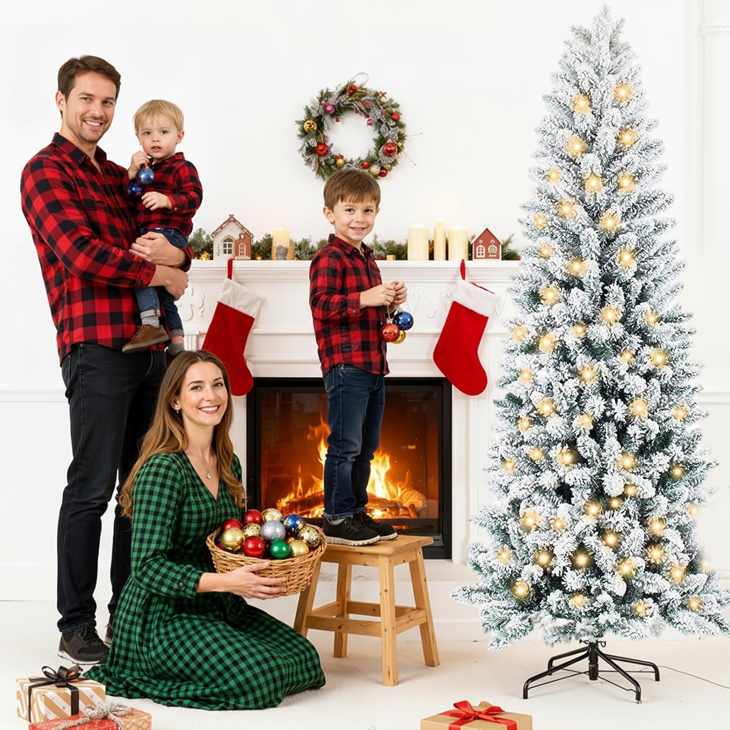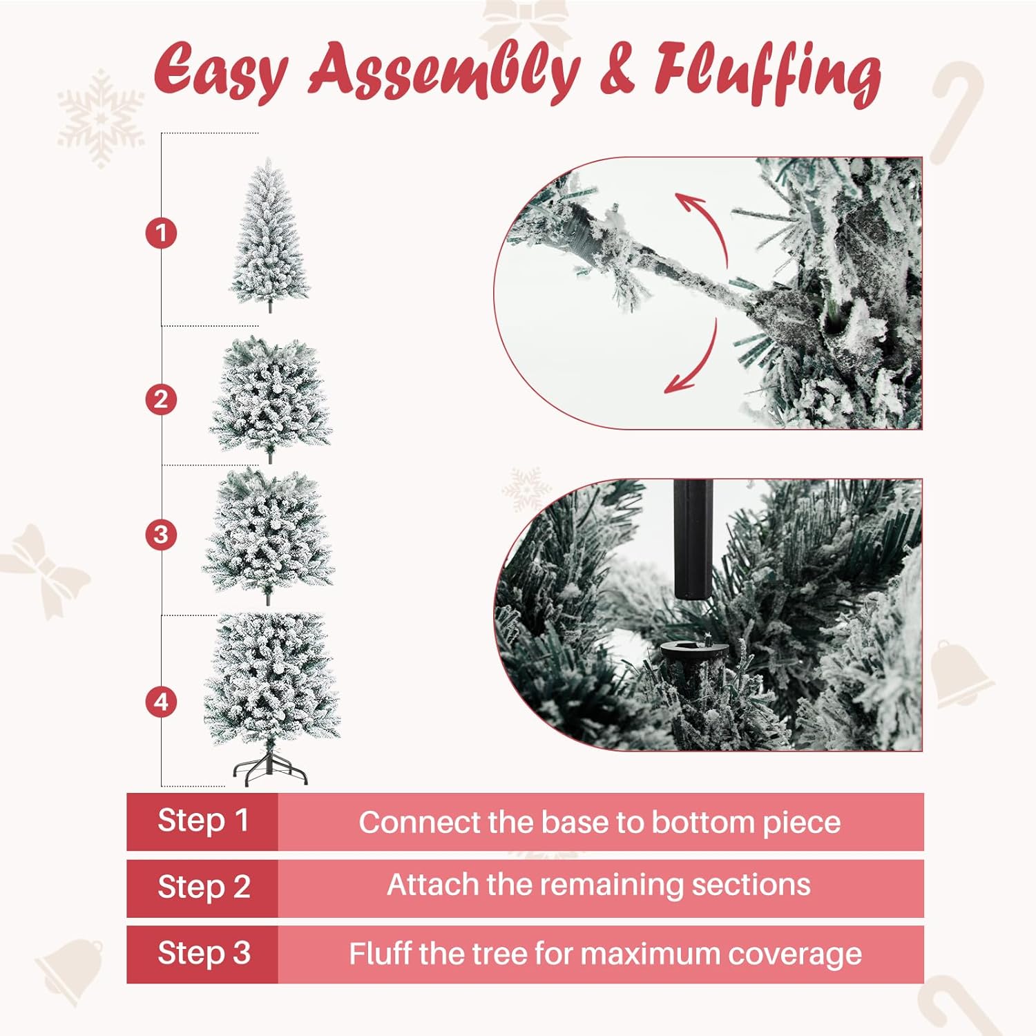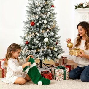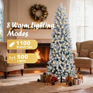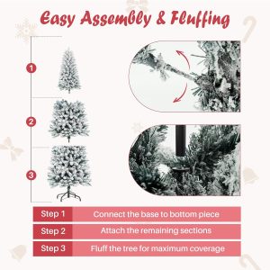 - [Lifelike Snowy Elegance]Crafted from high-quality, fire-resistant PVC, this Christmas tree features lush green branches beautifully dusted with soft white flocking for a natural winter-kissed look. The realistic snowy texture and durable PVC materials mimic the charm of a fresh snowfall, while the full foliage offers excellent ornament support. Effortlessly fluff the branches to create a stunning snowy-green silhouette that brings a magical and cozy winter atmosphere to your holiday celebrations.