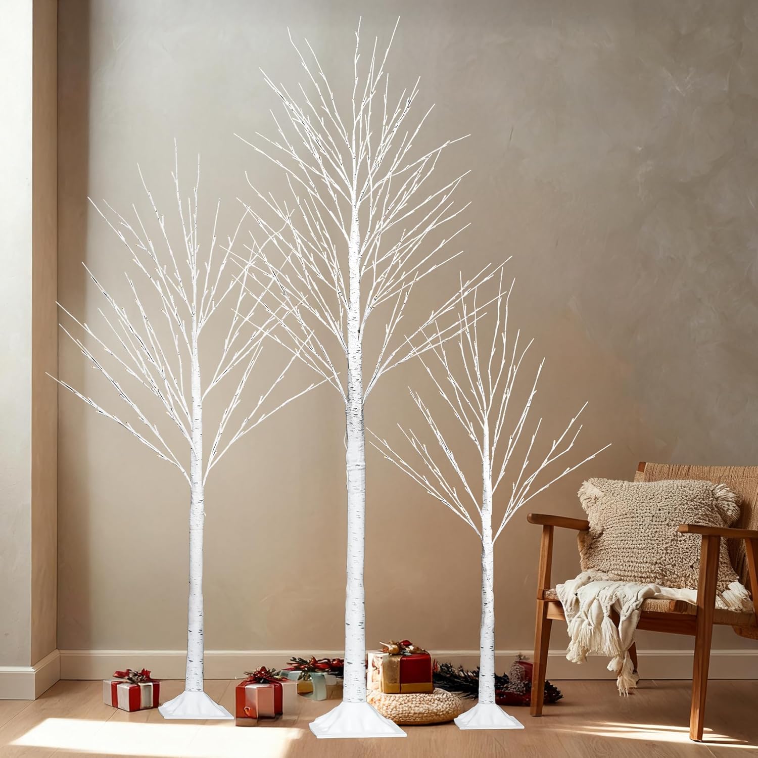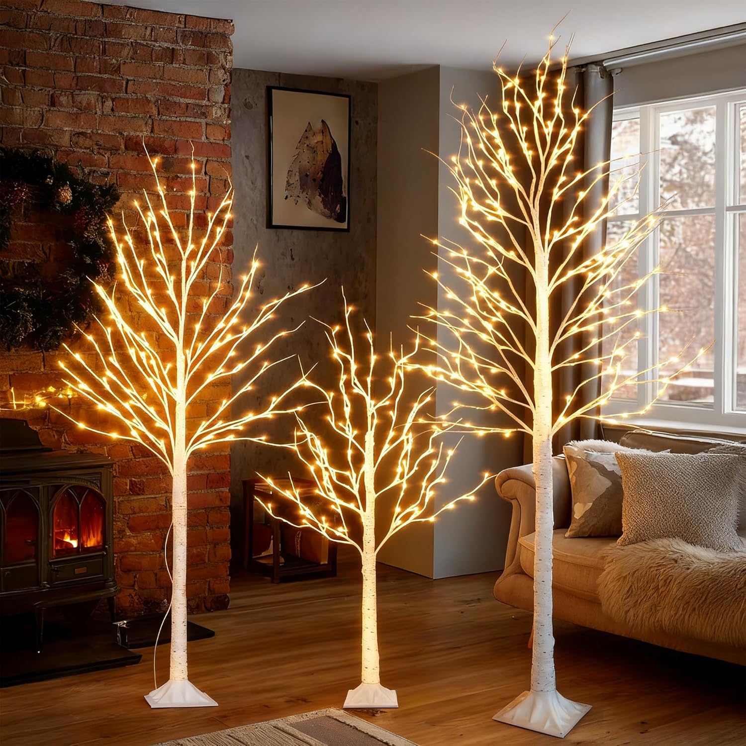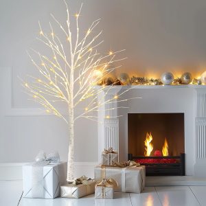 - Set of 3 Lighted Birch Tree: This set includes three beautifully crafted birch trees in different sizes: 4FT (96 LED), 6FT (120 LED), and 8FT (240 LED). These warm white lights provide a soft and inviting glow, enhancing the beauty of the trees. The trees are perfect for creating a cozy and festive atmosphere in any space
